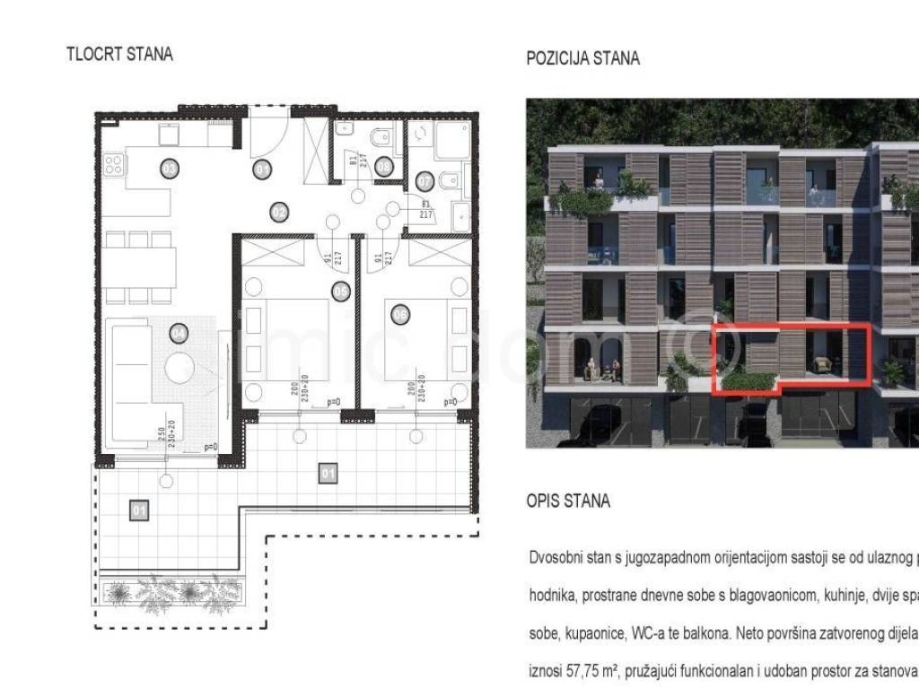 Wir vermitteln beim Verkauf eine hochwertige Neubauwohnung in ruhiger Lage, weniger als fünf Autominuten vom Zentrum von Omis entfernt. Das lichtdurchflutete Gebäude besticht durch seine attraktive Architektur und erfüllt alle Anforderungen modernen Wohnens. Die Wohnung befindet sich im ersten Obergeschoss eines Gebäudes mit Erdgeschoss (Garagenstellplätze) sowie zwei weiteren Obergeschossen (zweites, drittes und viertes Obergeschoss). Die Wohnfläche beträgt 67,37 m und umfasst zwei Schlafzimmer, ein Badezimmer, ein Gäste-WC sowie ein geräumiges Wohnzimmer mit offener Küche und Essbereich. Vom Wohnbereich gelangt man auf einen schönen Balkon mit Blick ins Grüne. Sorgfältig ausgewählte Baumaterialien tragen zum hochwertigen Eindruck bei. Zur Ausstattung gehören unter anderem eine bewährte Klimaanlage, moderne Fliesen und Sanitärkeramik sowie Parkettböden namhafter Hersteller. Gegen Aufpreis kann ein Außenstellplatz oder ein Garagenstellplatz hinzugebucht werden. Da es sich beim Bauträger um eine juristische Person handelt, entfällt die Grundsteuer von 3 %. Die Nähe zu allen Annehmlichkeiten, die ruhige Lage und die hohe Bauqualität machen dieses neue Gebäude zu einer ausgezeichneten Wahl. Die Eigentumsverhältnisse sind geklärt.