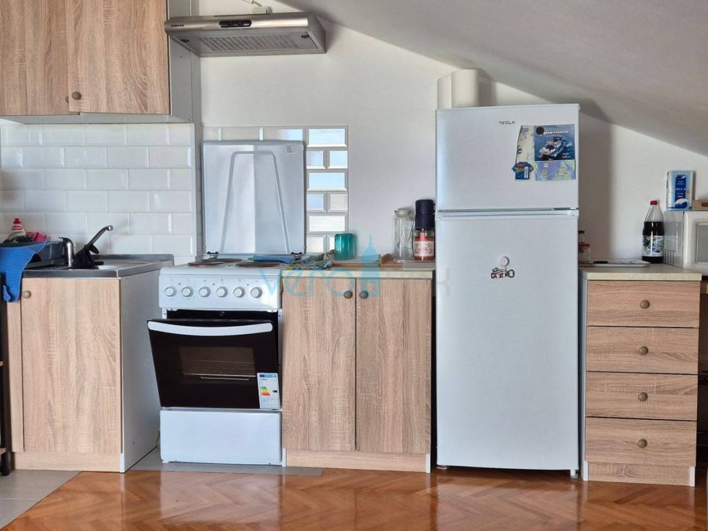 Njivice, Insel Krk, praktische Einzimmerwohnung mit offenem Meerblick. Die Wohnung mit einer Gesamtfläche von 35 m² befindet sich im zweiten Stock eines Wohngebäudes mit 7 Wohnungen. Tatsächlich handelt es sich bei der Lage der Wohnung um ein hohes Dachgeschoss mit hochwertiger Isolierung des Betondachs. Sie besteht aus einem Eingangsflur, einem Badezimmer, einem Wohnzimmer mit Küche, einem Schlafzimmer sowie einem großzügigen überdachten Balkon, von dem aus sich ein wunderschöner Panoramablick auf das Meer und die Umgebung bietet.