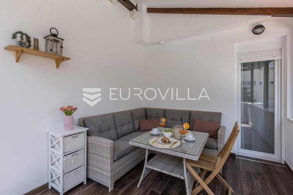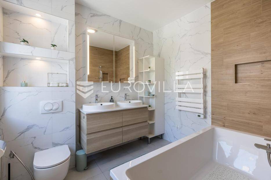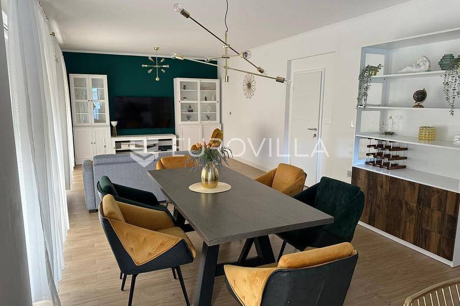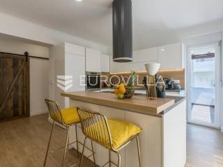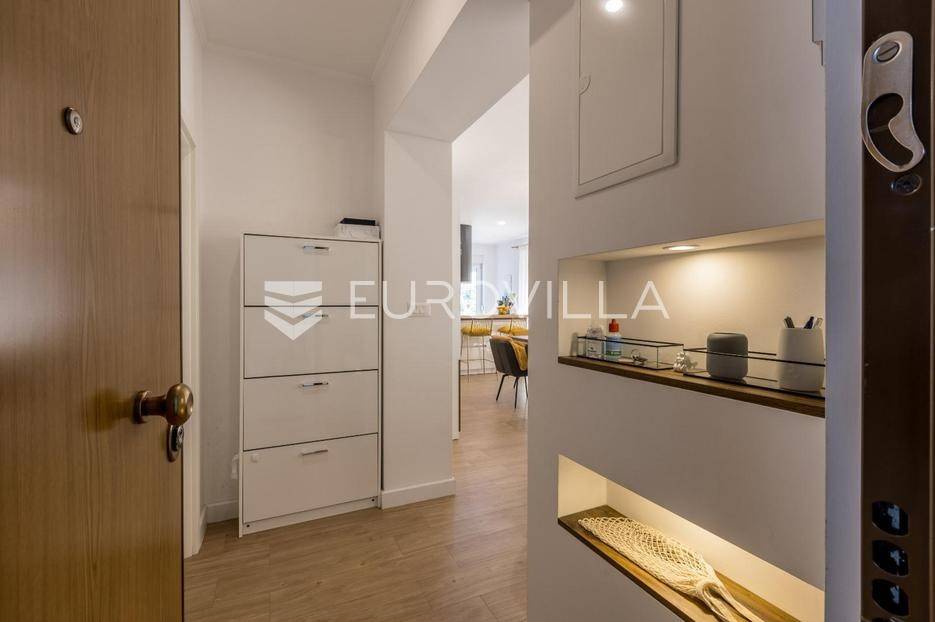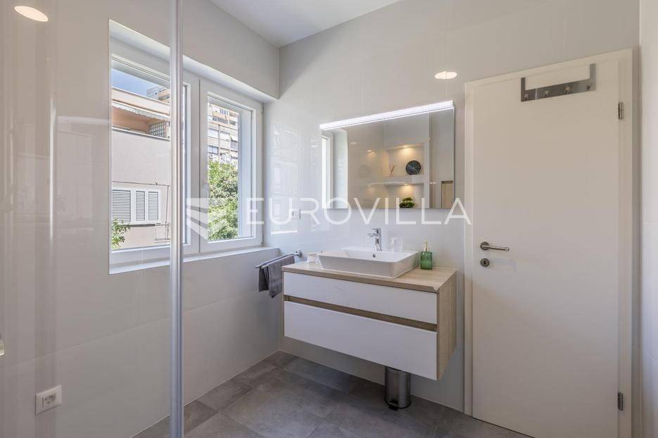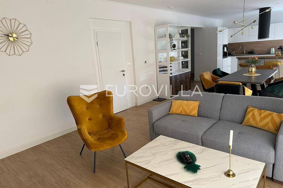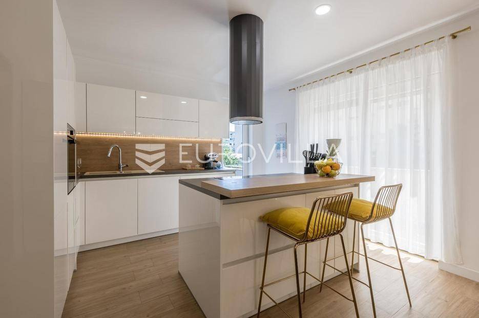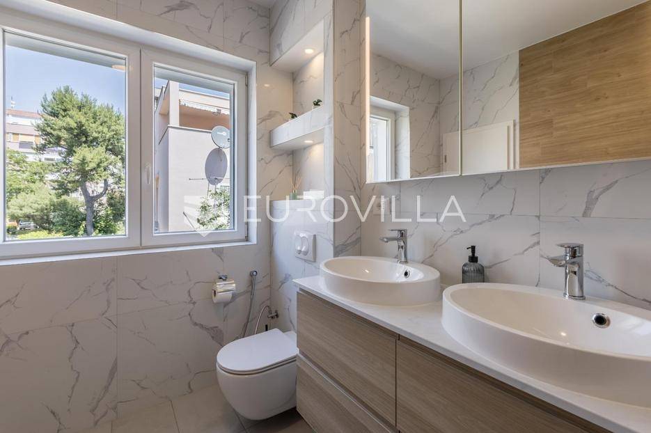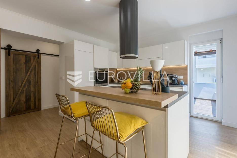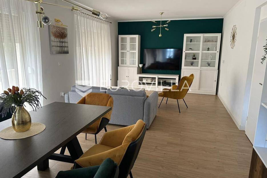 Na prvom katu male zgrade prodaje se potpuno renoviran trosobni stan od 109 m², orijentiran na sjever, istok i jug, što osigurava obilje prirodnog svjetla tijekom cijelog dana.Stan se sastoji od prostranog i modernog otvorenog prostora koji se čine kuhinja, blagavaonice i dnevni boravak, tri udobne spavaće sobe, dvije elegantne kupaonice, velikog balkona okrenutog prema jugu i prostrane natkrivene terase idealne za opuštanje. Prodaje se kompletno namješten i opremljen.Cijena uključuje i garažu - velika prednost u ovom dijelu grada.Lokacija je izuzetno praktična, u neposrednoj blizini trgovina, škola, vrtića i javnog prijevoza.
