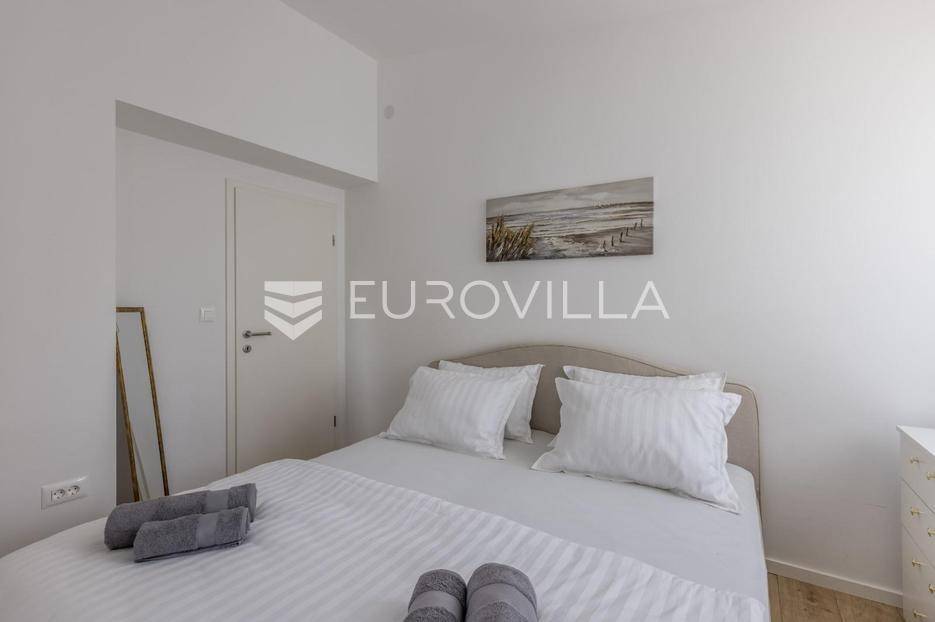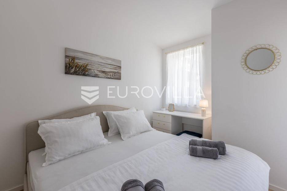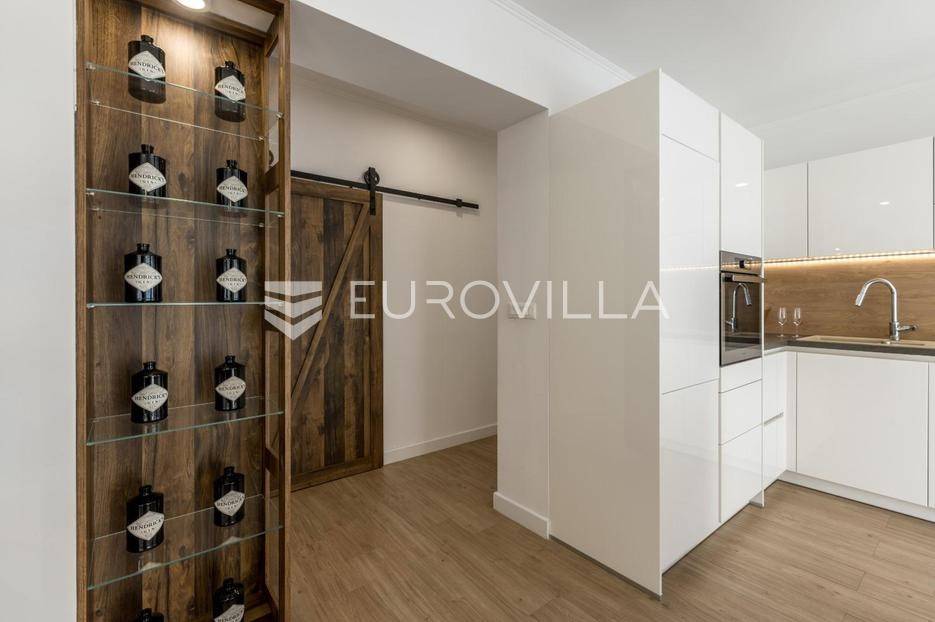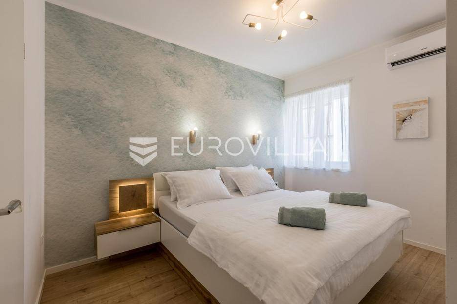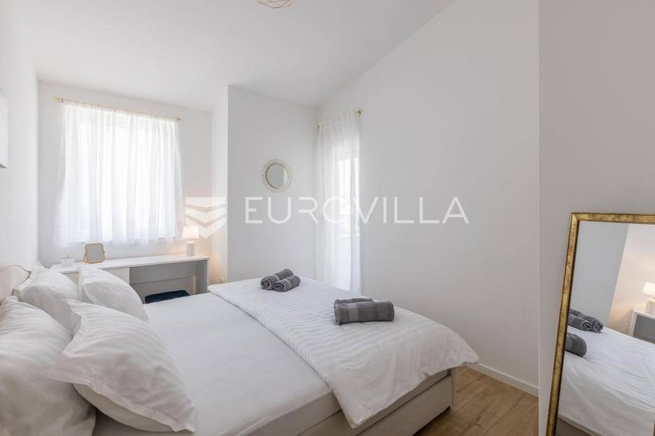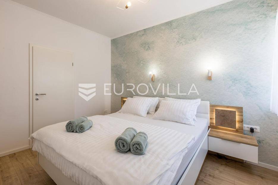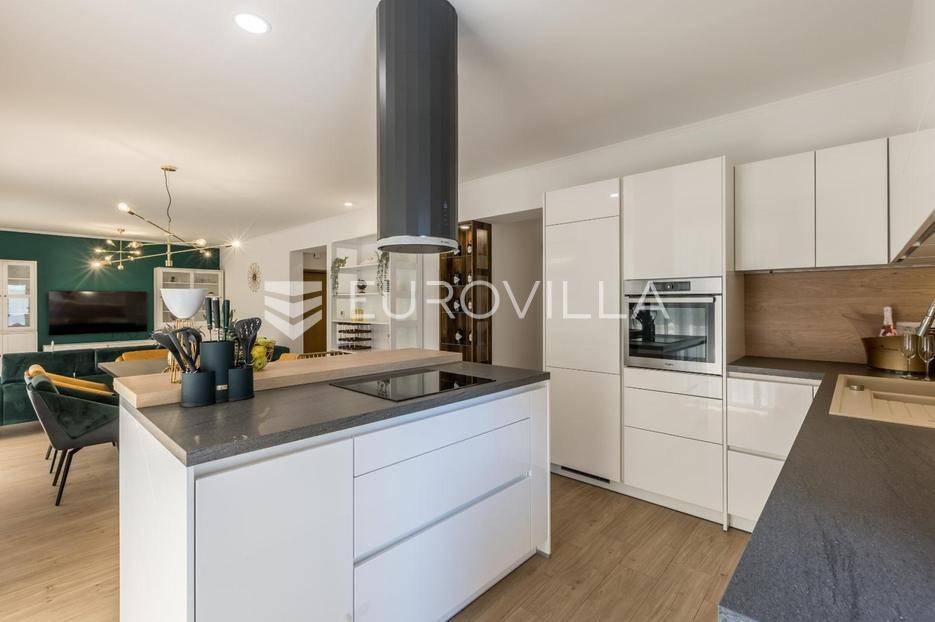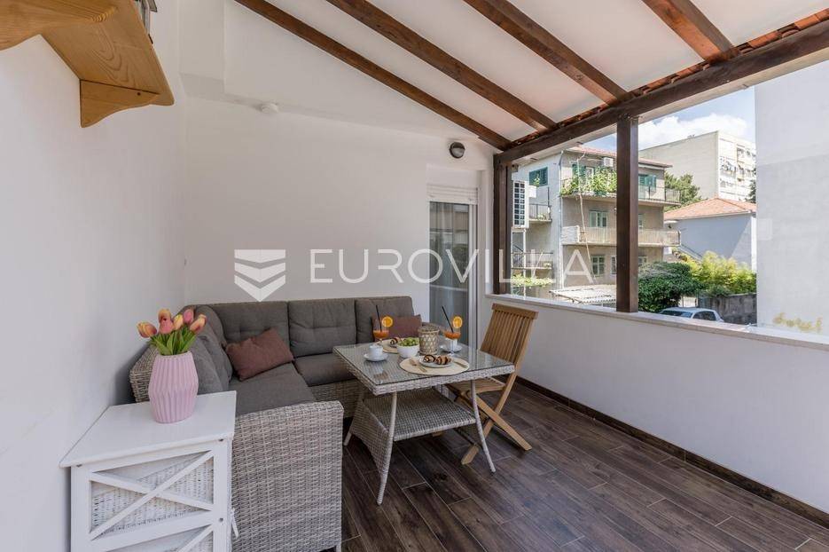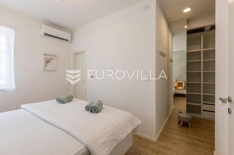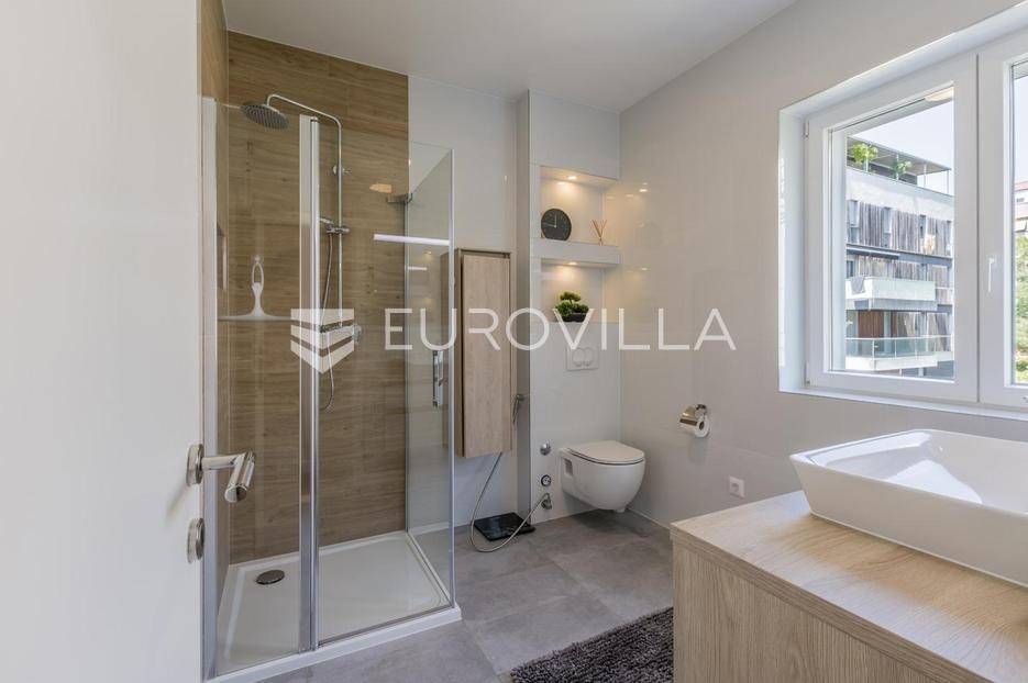 Na prvom katu male zgrade prodaje se potpuno renoviran trosobni stan od 109 m², orijentiran na sjever, istok i jug, što osigurava obilje prirodnog svjetla tijekom cijelog dana.Stan se sastoji od prostranog i modernog otvorenog prostora koji se čine kuhinja, blagavaonice i dnevni boravak, tri udobne spavaće sobe, dvije elegantne kupaonice, velikog balkona okrenutog prema jugu i prostrane natkrivene terase idealne za opuštanje. Prodaje se kompletno namješten i opremljen.Cijena uključuje i garažu - velika prednost u ovom dijelu grada.Lokacija je izuzetno praktična, u neposrednoj blizini trgovina, škola, vrtića i javnog prijevoza.