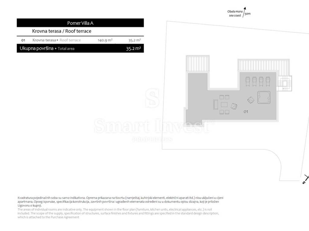Eine Außentreppe verbindet die Poolterrasse mit einer großen Dachterrasse, von der aus man einen atemberaubenden Ausblick genießt: auf den Yachthafen, eine ruhige Bucht und das kristallklare Wasser der Adria. Der perfekte Ort, um den Sonnenuntergang mit Freunden zu genießen oder einen entspannten Abend ausklingen zu lassen.