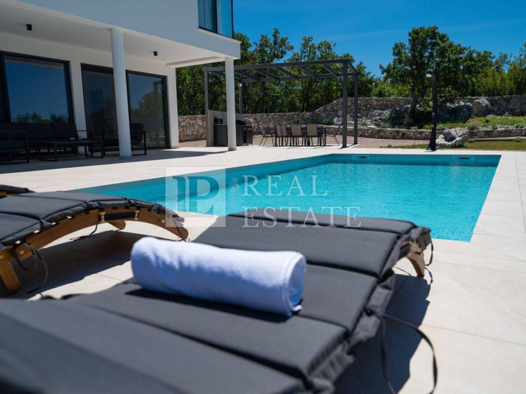 Eine Innentreppe führt in die obere Etage, wo sich vier luxuriöse Schlafzimmer (jedes Schlafzimmer hat ein eigenes Badezimmer) und eine Waschküche befinden. Jedes Schlafzimmer verfügt über einen Balkon mit Panoramablick auf das Meer und die Insel Krk.
