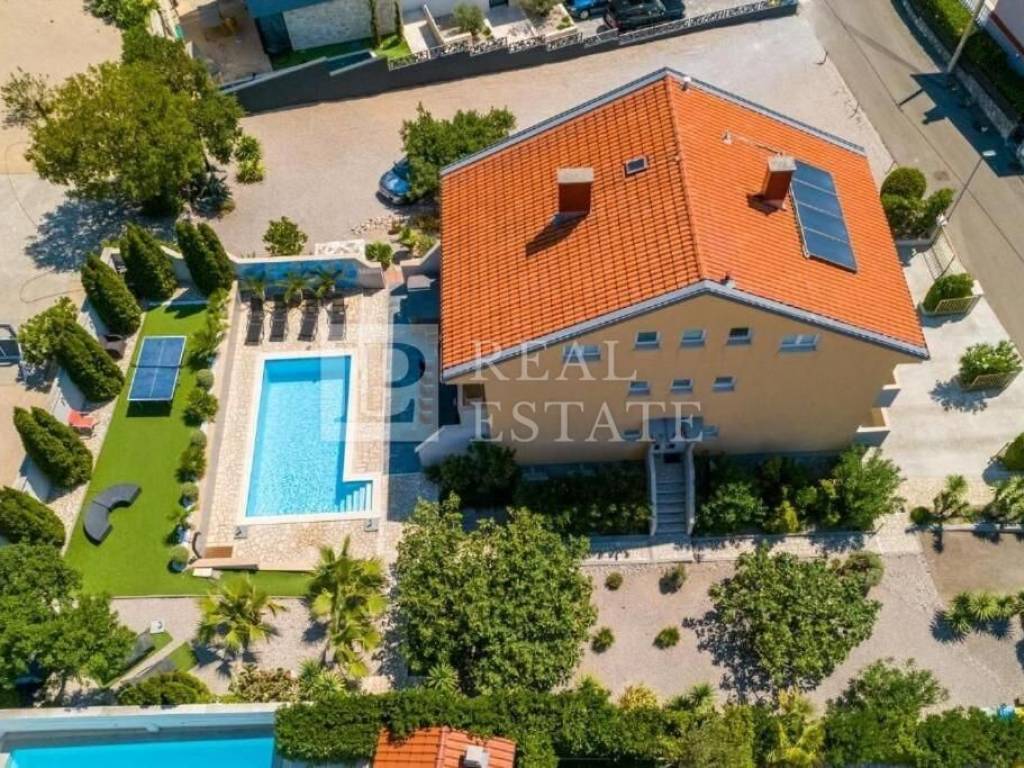 Das Haus hat eine Wohnfläche von 400 m2 und verteilt sich auf vier Etagen. Im Erdgeschoss des Hauses befinden sich zwei Garagen, ein Studio-Apartment und eine Zweizimmerwohnung. Im ersten Stock gibt es ein Wohnzimmer und eine Küche mit Esszimmer, das zum Innenhof mit Swimmingpool führt, zwei Schlafzimmer mit Zugang zu einer Südterrasse, zwei Badezimmer und einen Abstellraum.