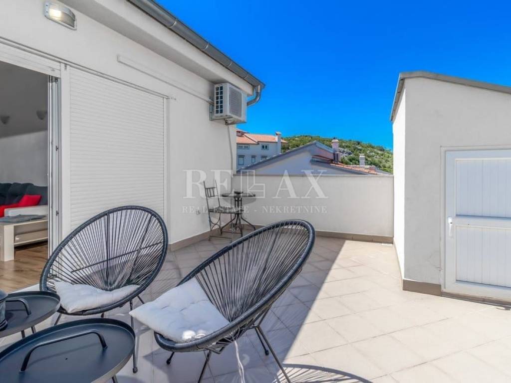Die Dachgeschosswohnung verfügt über einen Wohnbereich, einen Essbereich und eine Küche in einem Raum, ein Badezimmer, ein Schlafzimmer und eine Dachterrasse mit beeindruckendem Blick auf Vinodol.