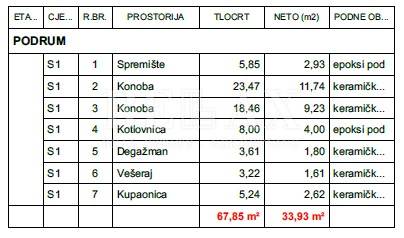 Das Haus besteht aus einem Keller, einem Erdgeschoss und einem ersten Stock. Im Keller befinden sich ein Badezimmer, eine Waschküche, zwei Tavernen, ein Heizraum und ein Abstellraum.