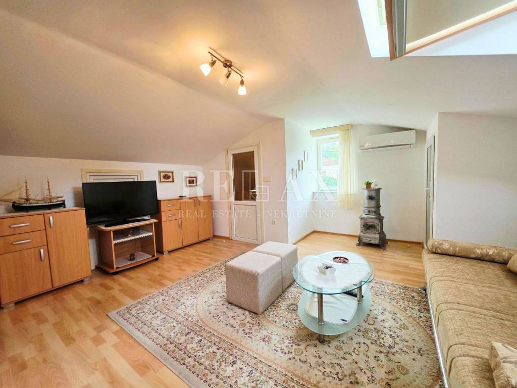 Die zweite Wohnung liegt im ausgebauten Dachgeschoss und hat eine Fläche von 61,20 m². Sie ist über eine Innentreppe aus dem gemeinsamen Flur des Gebäudes zugänglich. Diese Einheit umfasst ein großes Wohnzimmer mit Küche, ein Schlafzimmer, ein Badezimmer sowie zwei kleinere Abstellräume. Der Raum bietet einen Blick auf das Meer und die Umgebung, was das Gefühl von Privatsphäre und Ruhe zusätzlich verstärkt.