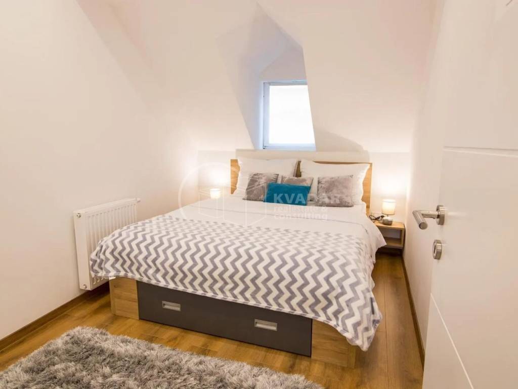 Stan je u potkrovlju zgrade bez lifta, površine 72m2 (podno 87m2) i organiziran je kao dvije potpuno odvojene stambene jedinice, sa kompletno opremljenim kuhinjama i kupaonicama. Veća stambena površina ima i zasebnu spavaću sobu. Oba stana su trenutno u najmu.