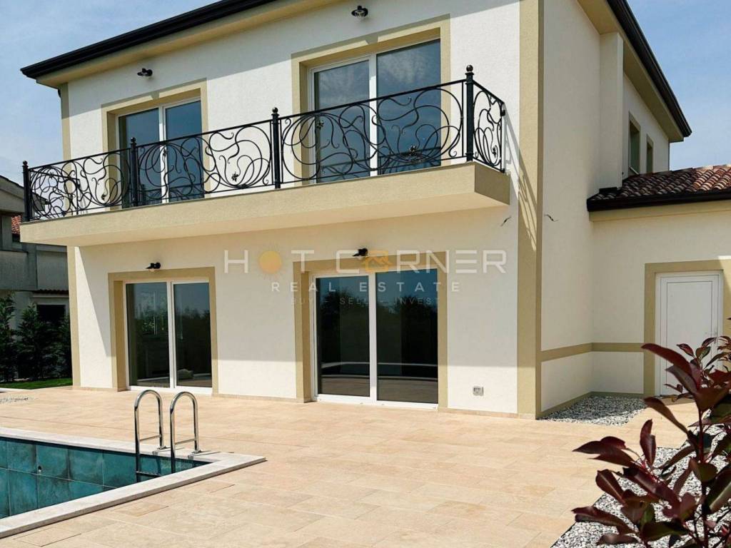 Eine neu erbaute Villa mit einem 550m2 großen Grundstück und einem Pool mit Meerblick steht zum Verkauf. Die Villa umfasst 2 überdachte Parkplätze, einen Heizungsraum und einen Technikraum von 19m2. Sie liegt 4,5 km von der Stadt und dem Meer entfernt und befindet sich im Dorf Nova Vas an einer asphaltierten Straße. In unmittelbarer Nähe (100m) befinden sich 2 Geschäfte, Restaurants, eine Post und eine Kirche.