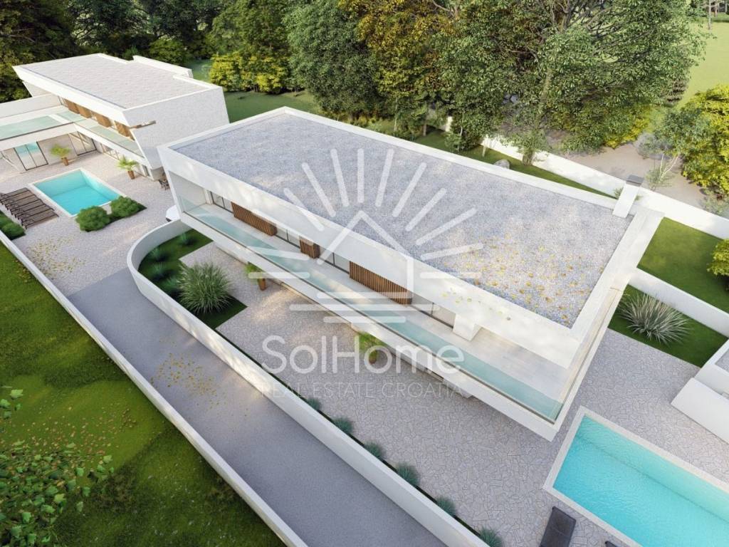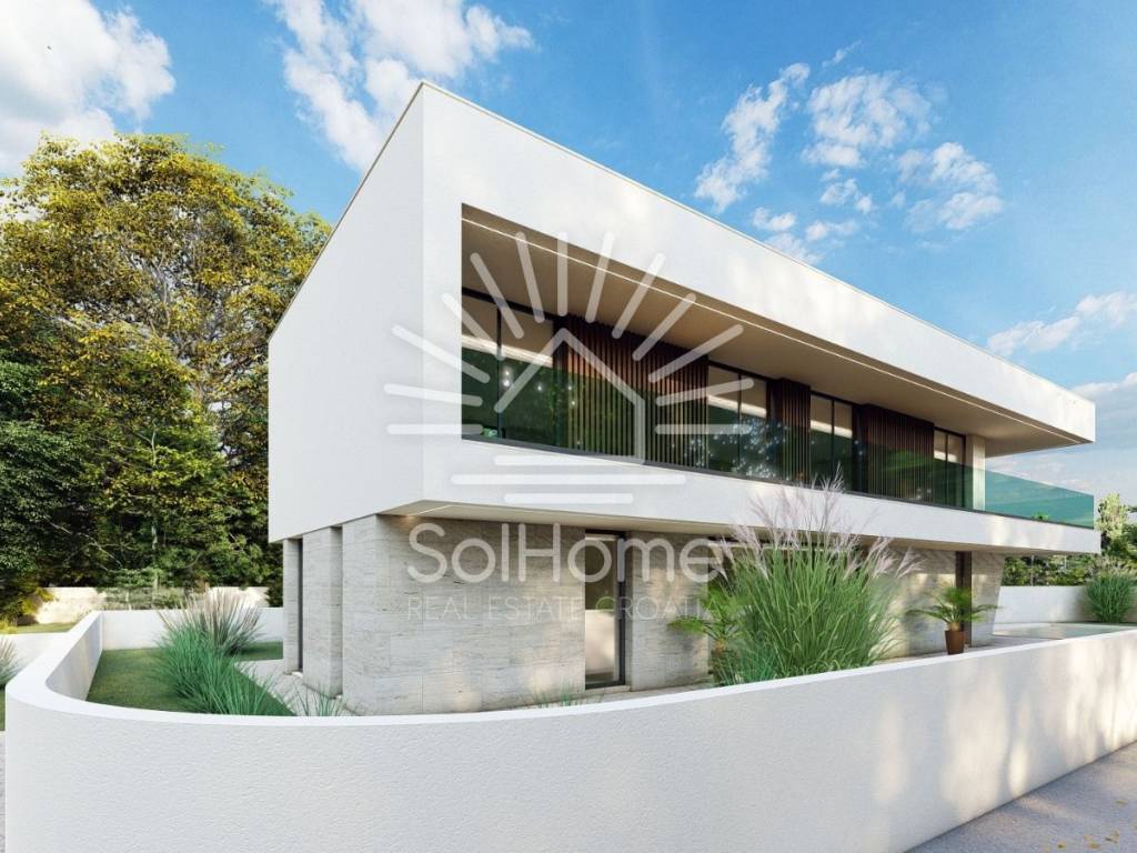Moderna i elegantna vila s 163 m² neto unutarnjeg prostora i bruto površinom od 259,5 m². Prizemlje se sastoji od dnevnog boravka, kuhinje, blagovaonice, ostave, gostinjskog WC-a, praonice i tehničke prostorije. Natkrivena terasa vodi do bazena od 32 m². Kat se sastoji od četiri spavaće sobe, dvije kupaonice i prostrane natkrivene terase s očaravajućim pogledom na more.