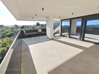 Über eine Außentreppe gelangt man zur Dachterrasse, die über einen Pool und einen Technikraum verfügt. Von der Dachterrasse aus bietet sich ein Panoramablick auf das Meer. Zusätzlich zur Wohnung stehen dem neuen Eigentümer zwei Parkplätze zur Verfügung. Unter Berücksichtigung aller nutzbaren Innen- und Außenflächen, einschließlich Terrassen und Parkplätze, verfügt die Wohnung über eine tatsächliche Brutto-Nutzfläche von 270 m².