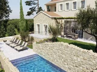 Der Hof ist von einer Mauer umgeben, die wunderschön mit mediterranen Pflanzen und Blumen geschmückt ist. Auf den Fundamenten der Ruinen eines alten Steinhauses befindet sich ein 12 x 4 Meter großes Schwimmbad, das den Eindruck erweckt, ein Teil der Natur zu sein, der vollständig in die Umgebung eingetaucht ist. Es gibt drei Parkplätze. Die Villa ist von viel Grün umgeben und auf dem Grundstück gibt es Eichen- und Maulbeerbäume sowie andere mediterrane Pflanzen wie Oliven, Granatäpfel, Feigen usw.