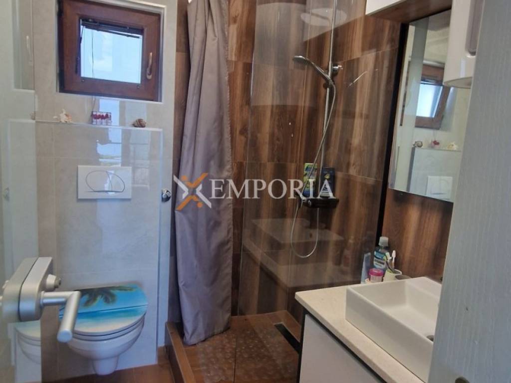 Zum Verkauf steht der östliche Teil eines Doppelhauses in Rovanjska, 680 m vom Meer und 900 m vom Ortszentrum entfernt. Das Haus besteht aus zwei separaten Wohneinheiten, jeweils eine im Erdgeschoss und eine im Obergeschoss, mit einer gesamten Wohnfläche von 107,64 m². Die Gesamtfläche inklusive Pool beträgt 127,64 m².Die Immobilie ist komplett möbliert und sofort nutzbar. Im Garten befindet sich ein 20 m² großer, mit Mosaik ausgeführter Swimmingpool.Beide Wohnungen haben denselben Grundriss: ein Wohnzimmer mit Küche, zwei Schlafzimmer, ein Badezimmer und eine überdachte Terrasse. Die Erdgeschosswohnung hat 54,02 m², die Wohnung im Obergeschoss 53,62 m². Zum Haus gehören zudem ein Garten von 96,12 m² sowie ein Abstellraum. Es stehen sechs Parkplätze zur Verfügung. Der 20 m² große Pool ist mit Mosaik ausgeführt.Der Meerblick ist bereits im Erdgeschoss sehr gut und im Obergeschoss ausgezeichnet.