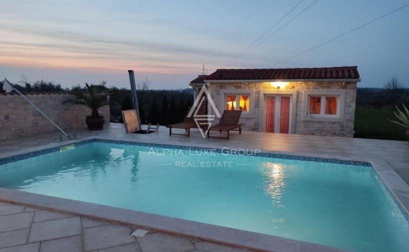 Der wunderschön angelegte und umzäunte grüne Garten umfasst eine Liegewiese, eine Außendusche, einen 32 m² großen Swimmingpool, eine Taverne für geselliges Beisammensein und einen Außenkamin.