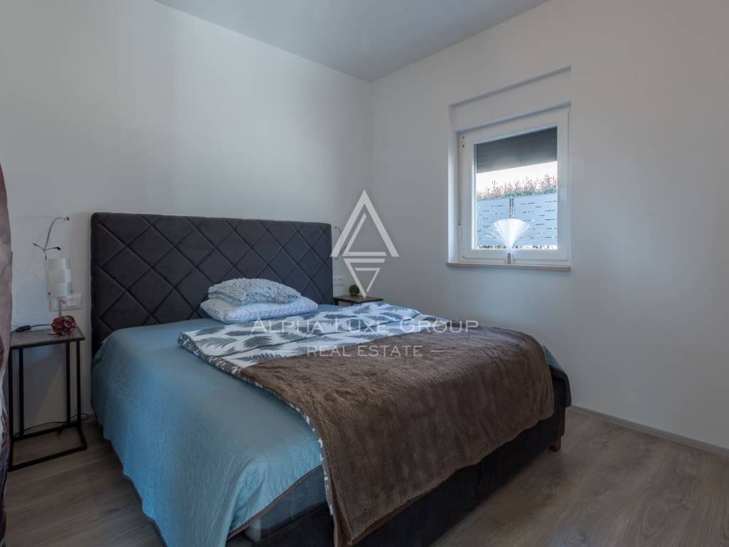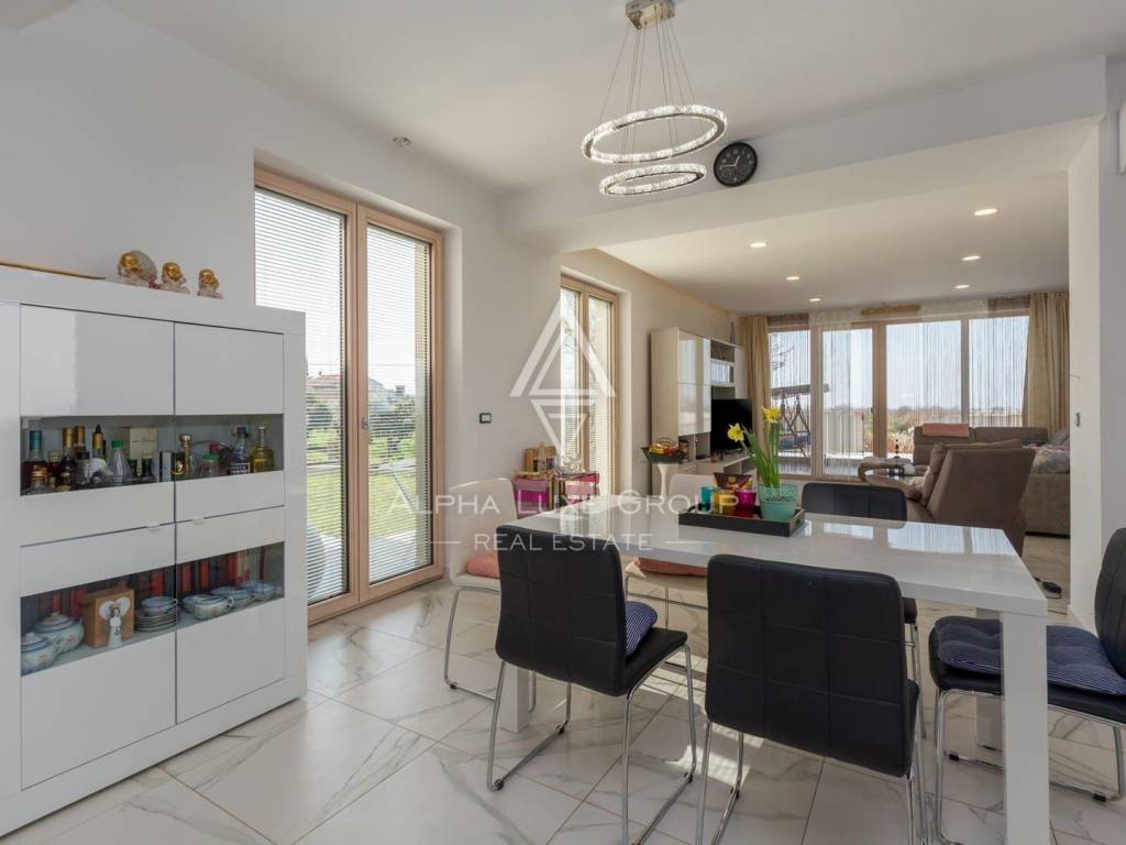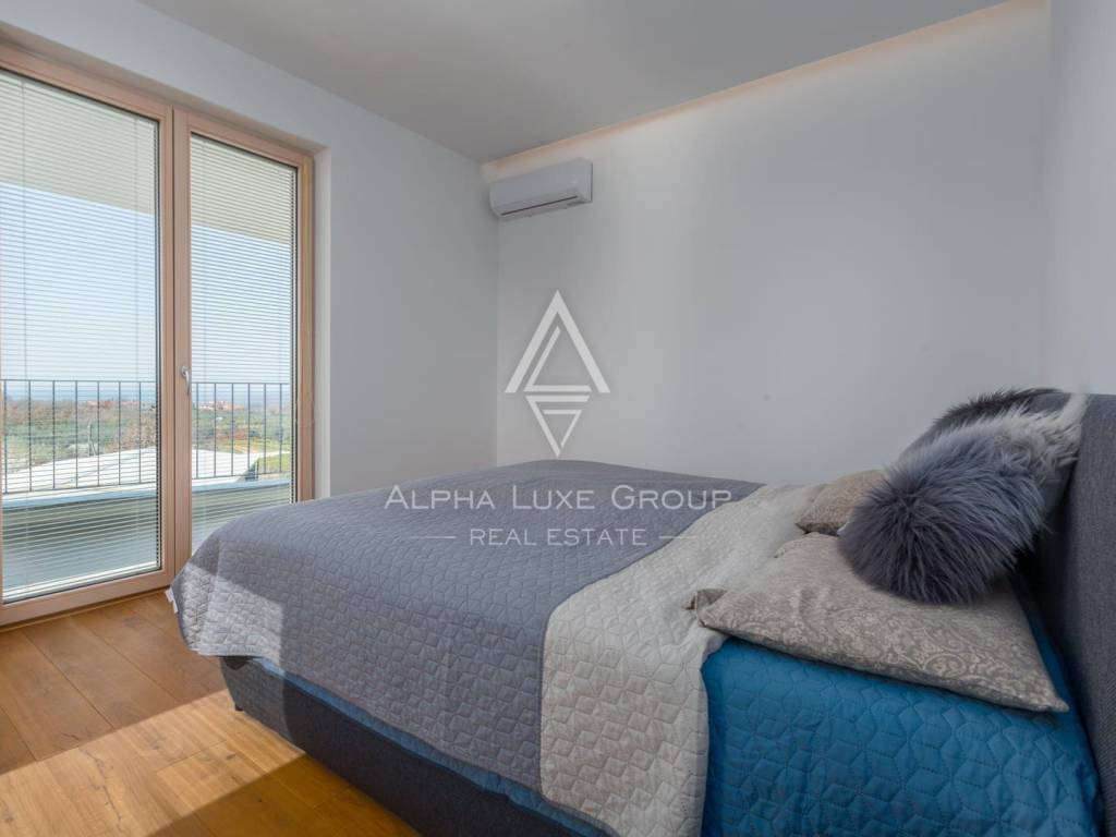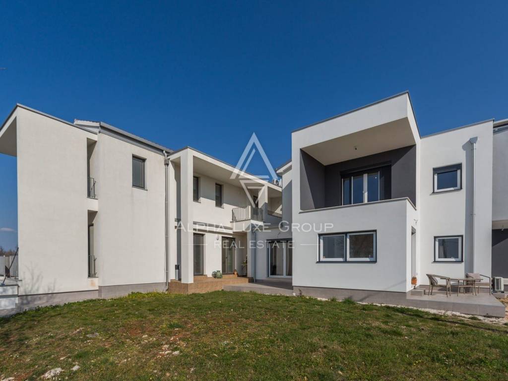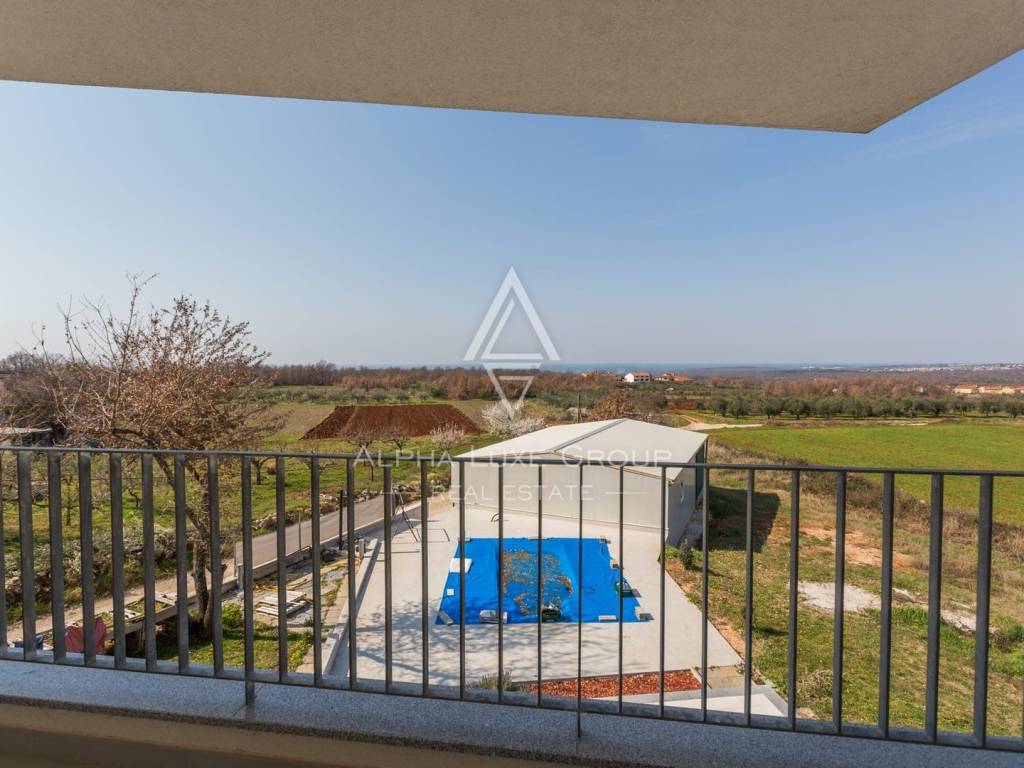 An einem ruhigen Ort, nur 6 km vom Zentrum von Porec und 3 km vom Meer entfernt, befindet sich diese schöne, neu erbaute, moderne Doppelhaushälfte mit Pool und Panoramablick auf das Meer vom Erdgeschoss.