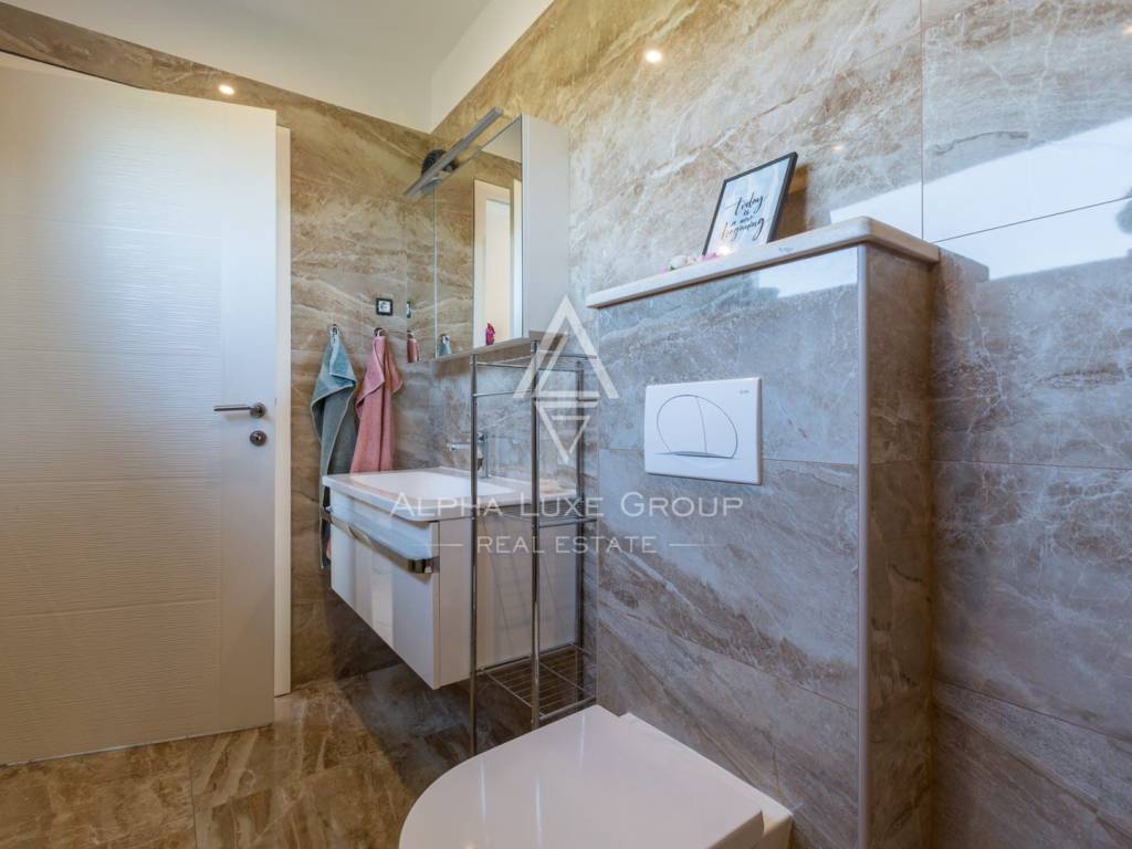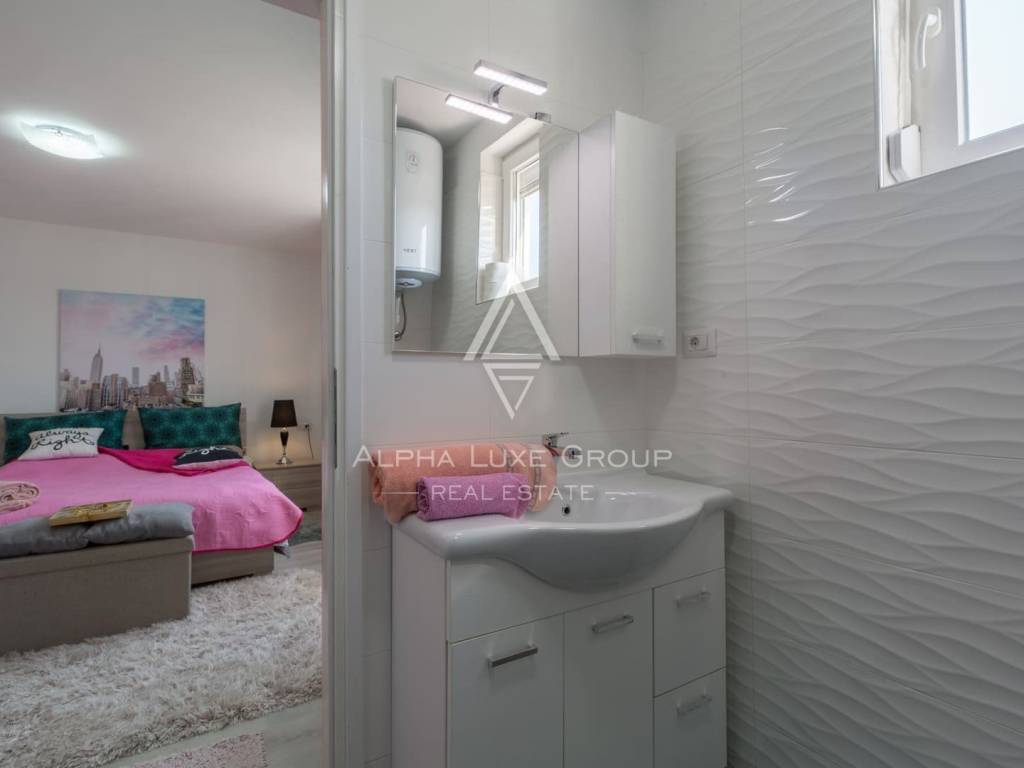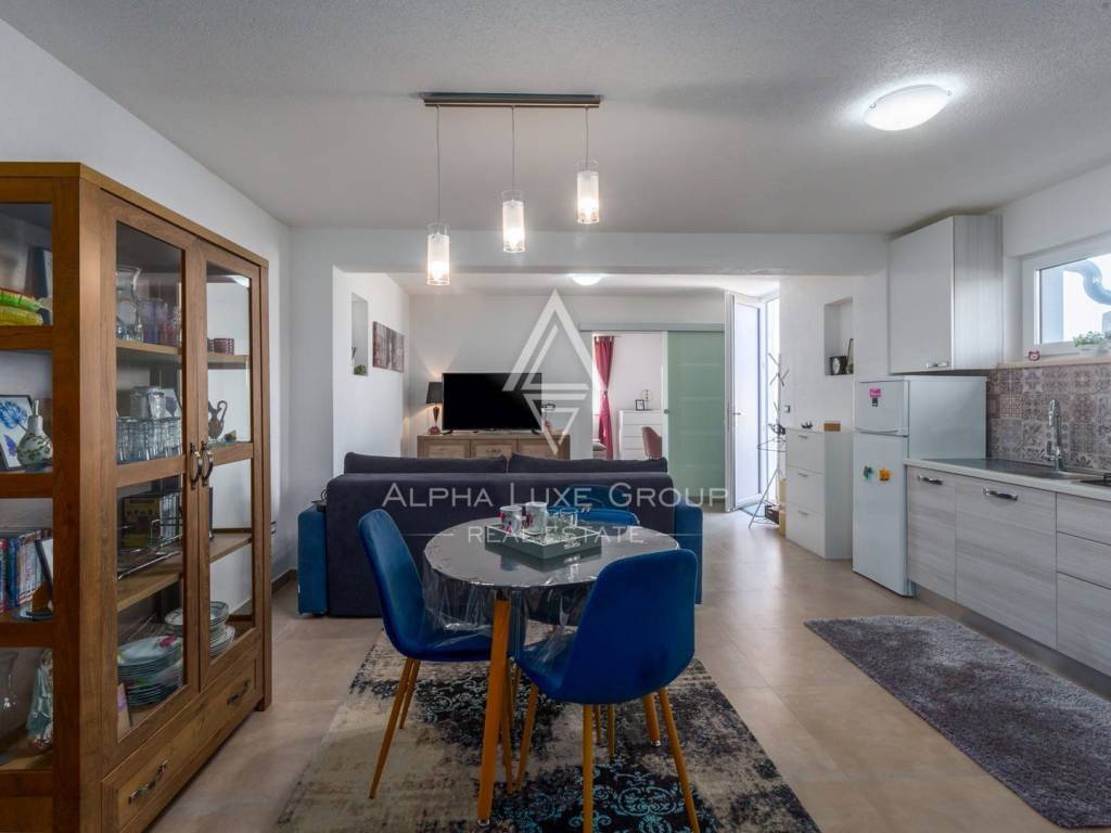 Im Erdgeschoss befinden sich zwei Apartments mit zwei Schlafzimmern, die jeweils einen separaten Eingang haben. Beide Apartments bestehen aus einem Wohnzimmer mit Küche und Essbereich, Bad mit WC und Schlafzimmer. Das Wohnzimmer einer Wohnung führt zu einer geräumigen Terrasse mit Blick auf das Meer.