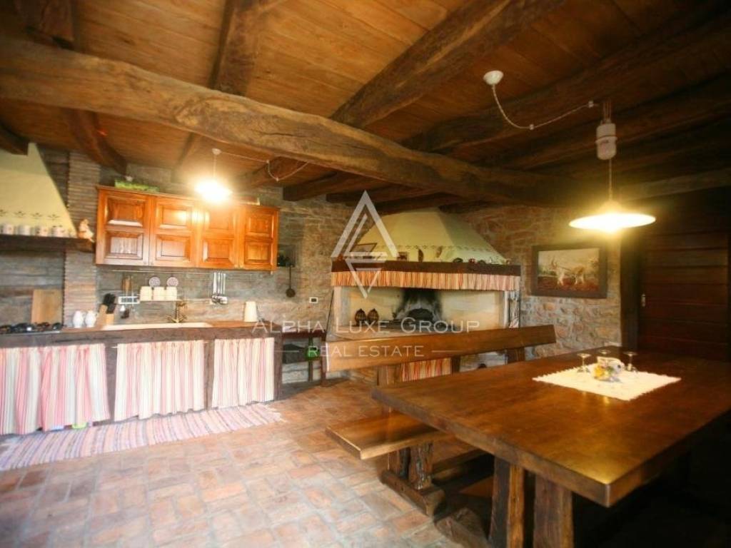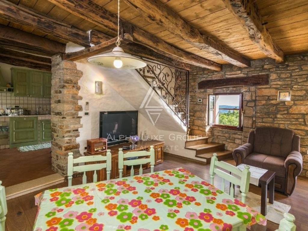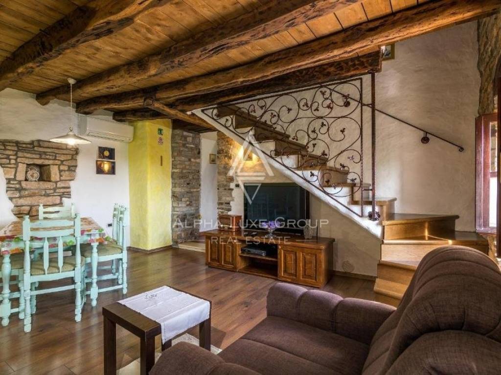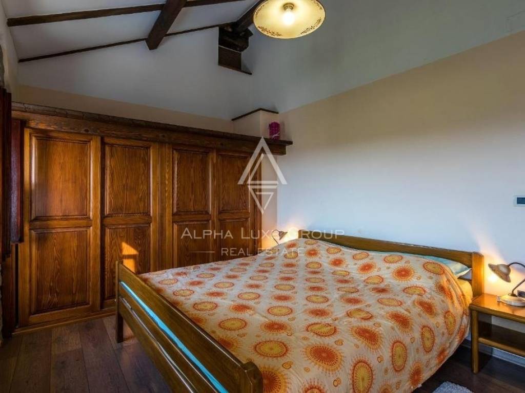 Der erste Stock besteht aus einem Wohnzimmer, einer Küche mit Kamin und einem Esszimmer, einem Badezimmer und einem Ausgang zu einer geräumigen Terrasse mit Panoramablick. Im Dachgeschoss befinden sich zwei Schlafzimmer.