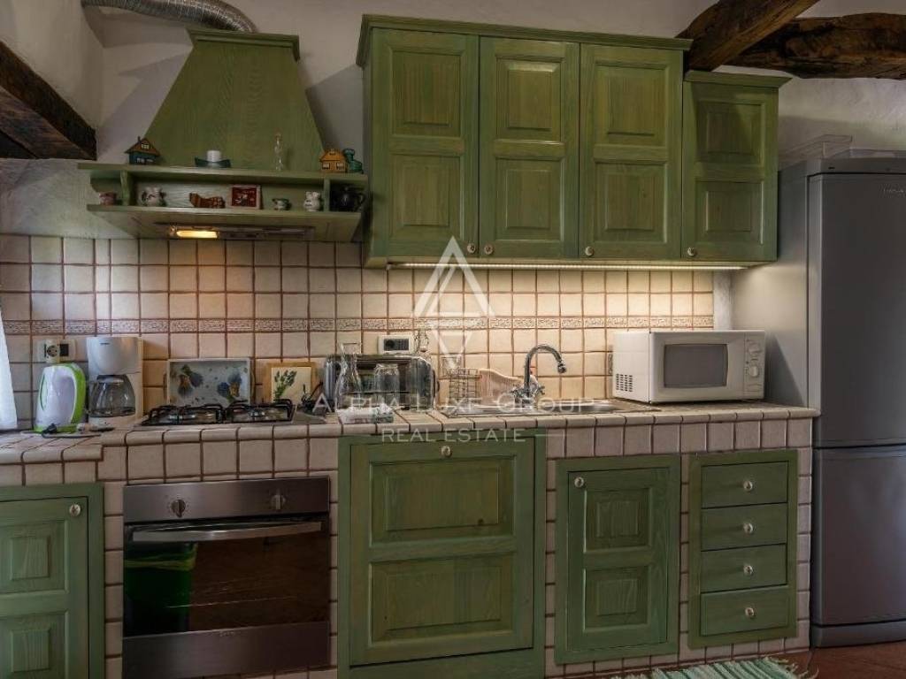 Das Haus wurde komplett renoviert, verteilt auf eine Gesamtfläche von 120 m2 auf drei Etagen, Erdgeschoss, Obergeschoss und Dachgeschoss. Im Erdgeschoss befindet sich eine geräumige Taverne mit Kamin und Sitzecke.
