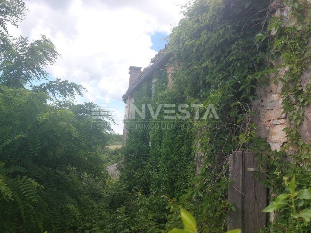 In einer kleinen Ortschaft unweit von Bale wird ein großzügiges Baugrundstück mit einer Fläche von 7.801 m² verkauft, auf dem ein eingezeichneter einheimischer istrischer Haus steht, das eine Grundfläche von 88 m² hat und sich über drei Etagen erstreckt: Erdgeschoss, Obergeschoss und Dachgeschoss.