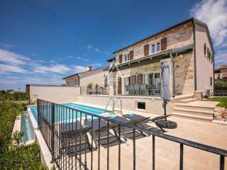 Die vollständig mit Stein gepflasterte Terrasse mit einem herrlichen 32 m2 großen Pool ist vom bewohnten Teil der Villa aus zu erreichen. Ein schöner Hof mit Gras und Pflanzen ist unten zu sehen. Das ganze Haus ist von einem hohen Zaun und soliden Steinsäulen umgeben, mit zwei überdachten Parkplätzen vor dem Gebäude.