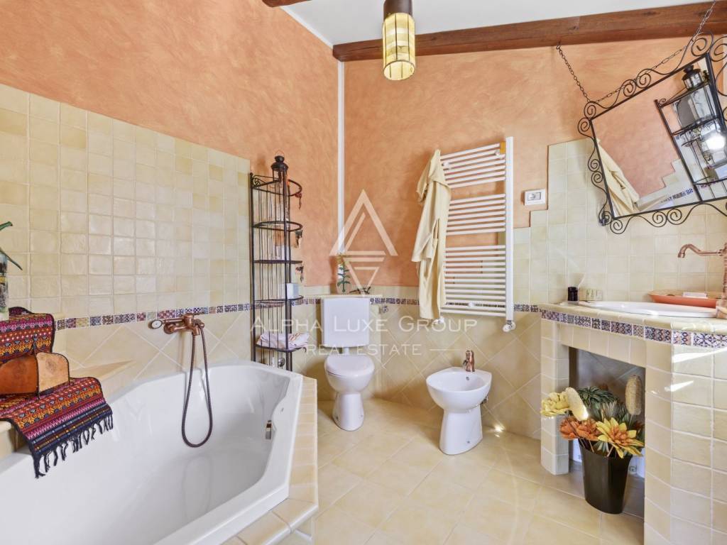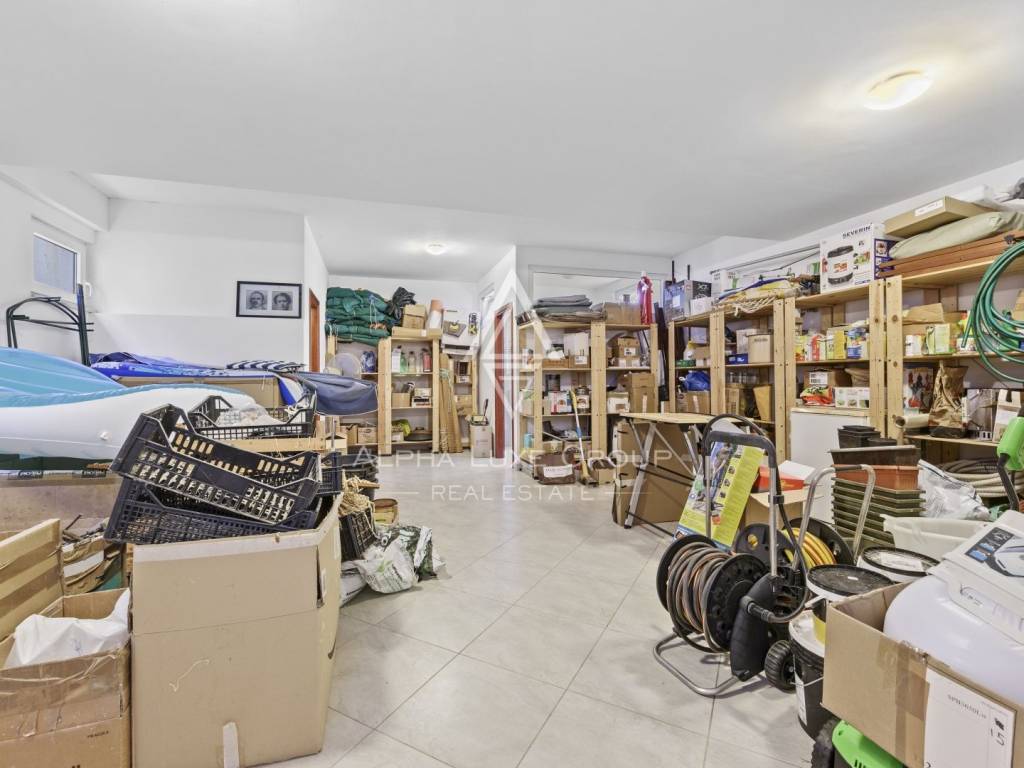 Eine elegante Holztreppe führt in das Obergeschoss, wo sich zwei großzügige Schlafzimmer befinden, die jeweils über eine eigene Terrasse mit herrlichem Meerblick sowie ein modernes Badezimmer verfügen. Im Untergeschoss gibt es einen Weinkeller, einen Technikraum und ein zusätzliches Badezimmer mit separatem Eingang, wodurch die Möglichkeit besteht, es in eine eigenständige Wohneinheit umzuwandeln.