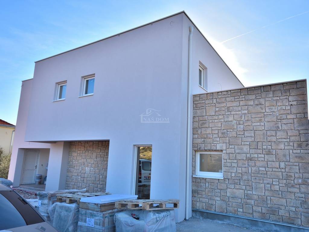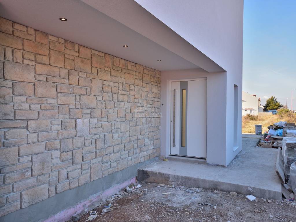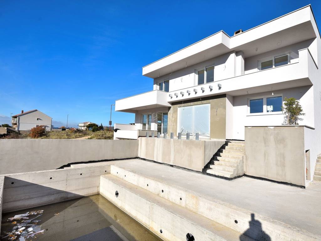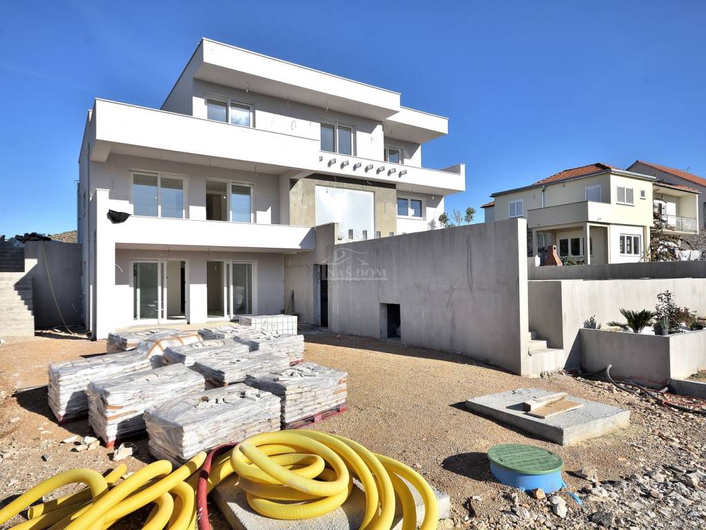 Šibenik, Donje Polje - **NEUBAU** moderner Luxusvilla mit Pool in ruhiger Lage mit Blick auf die Natur zu verkaufen. Das Haus mit einer gesamten Bruttogeschossfläche von 249m2 besteht aus drei Etagen: Untergeschoss, Erdgeschoss + Obergeschoss. Das Untergeschoss mit einer Nutzfläche von 45,6m2 besteht aus Fitnessraum, Badezimmer, Abstellraum und überdachter Terrasse mit 15,14m2. Das Erdgeschoss mit einer Nutzfläche von 92,12m2 besteht aus Eingang, Flur, WC, Waschküche, Treppenhaus, offener Küche mit Essbereich und Wohnzimmer mit Ausgang zur überdachten Terrasse von 21,36m2. Im Erdgeschoss befindet sich auch eine Garage mit 24,1 m2 sowie eine unüberdachte Terrasse von 16,57m2 und eine Außentreppe zum Garten. Über das Innentreppenhaus gelangt man in das Obergeschoss mit einer Nutzfläche von 80,78m2, das aus Flur, Badezimmer, Master-Schlafzimmer mit Ankleide und eigenem Bad sowie zwei Schlafzimmern besteht. Alle Zimmer haben Zugang zur Terrasse, bestehend aus einem überdachten Teil von 17,95m2 und einem unüberdachten Teil von 33,13m2.