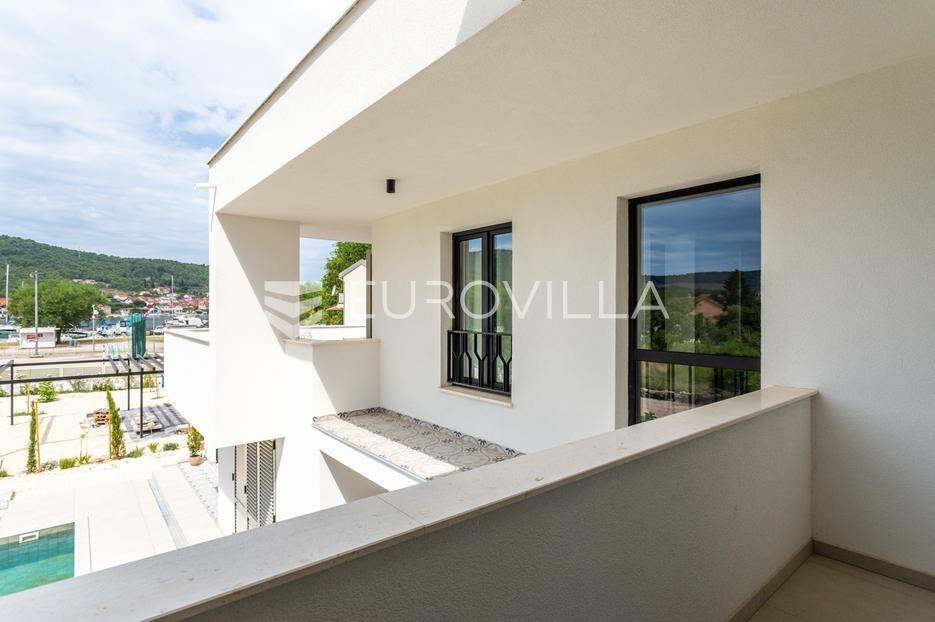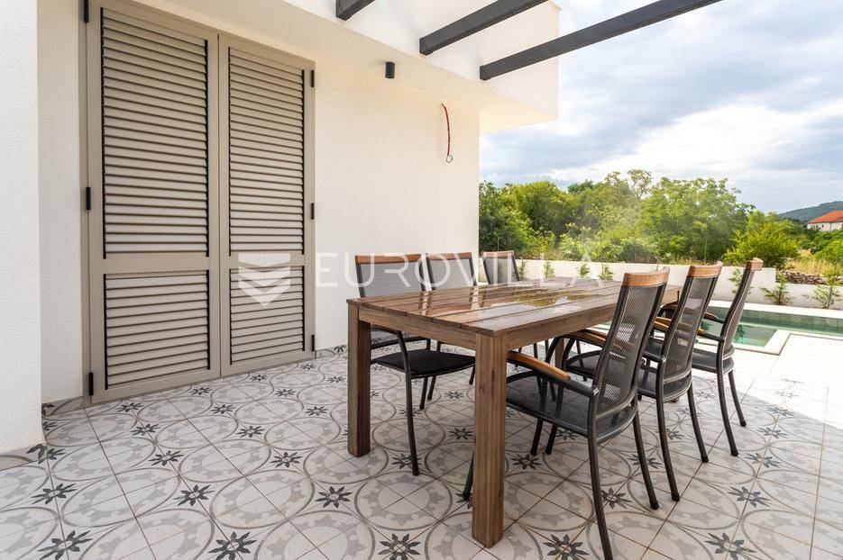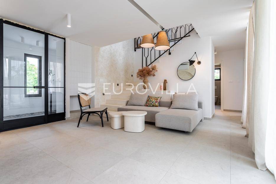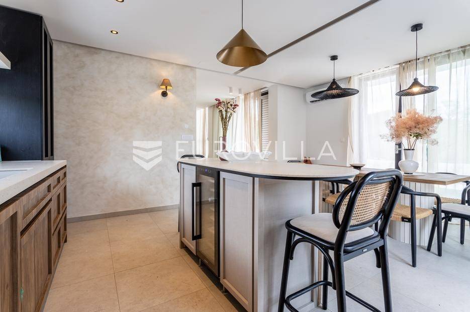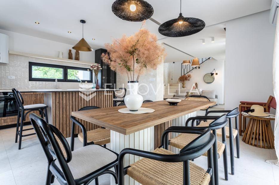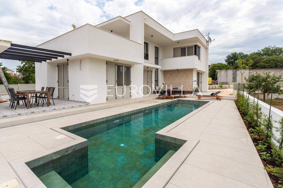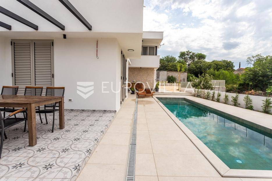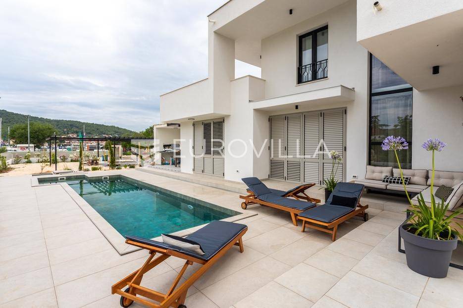 Novoizgrađena vila s bazenom u neposrednoj blizini mora bruto površine 283 m2 na zemljištu površine 1039 m2. Sastoji se od dvije etaže i prostrane okućnice. Na prizemnoj etaži se nalazi kuhinja, blagovaona, dnevni boravak, spremište/tehnička soba, kupaonica te jedna spavaća soba. Na prvoj etaži se nalaze tri spavaće sobe. Master soba posjeduje walk in ormar, kupaonicu te vlastitu prostranu terasu, preostale dvije spavaće sobe dijele zajedničku kupaonicu te svaka od soba ima vlastitu lođu. U dvorištu vile se nalazi natkrivena ljetna kuhinja s kominom, bazen, sunčalište, uređena okućnica te natkriveni i nenatkriveni parking za automobile.Grijanje i hlađenje riješeno putem šest klima jedinica, podnim grijanjem te su postavljeni solarni sistemi.Vila se prodaje u potpunosti namještena, pomno odabranim namještajem od strane dizajnera interijera. Nalazi se prvi red do mora, na samo 20 m od plaže, u blizini svih bitnih sadržaja. Navedeno je čini idealnom za ugodan život ali i za investiciju u svrhe turističkog poslovanja.Više informacija na upit.