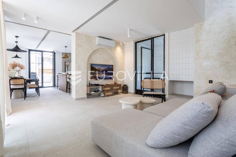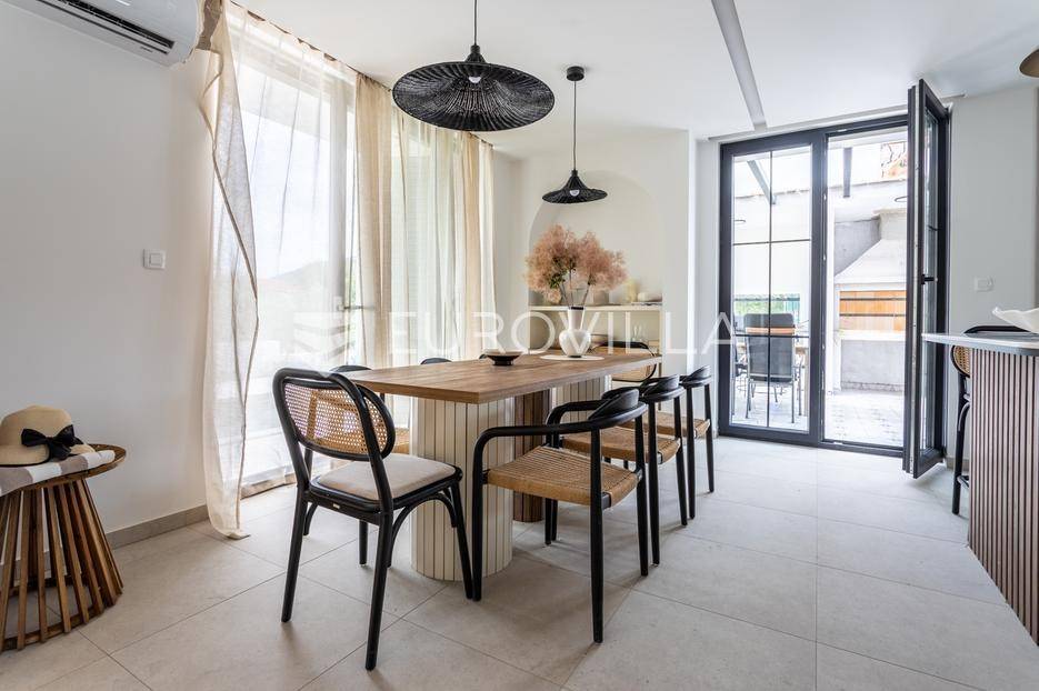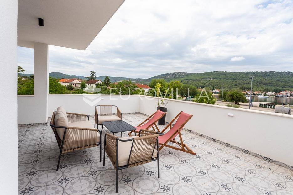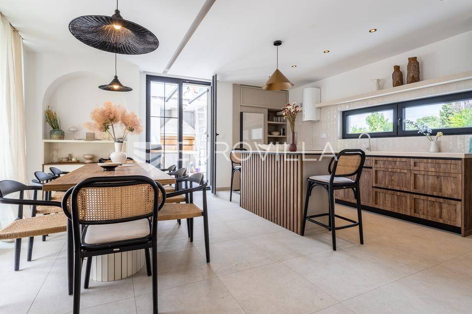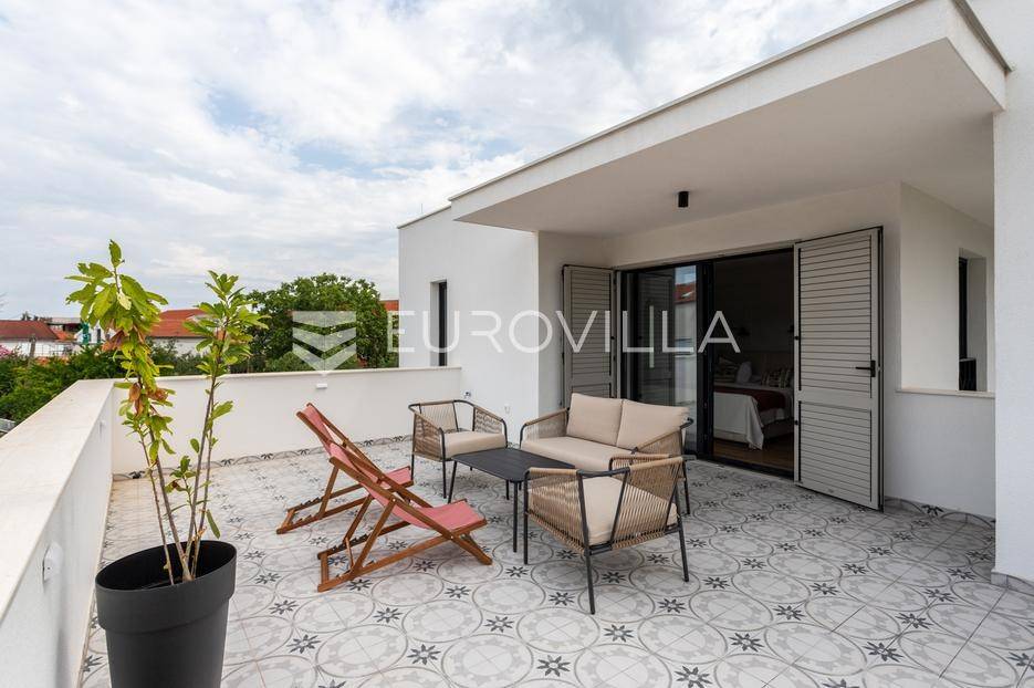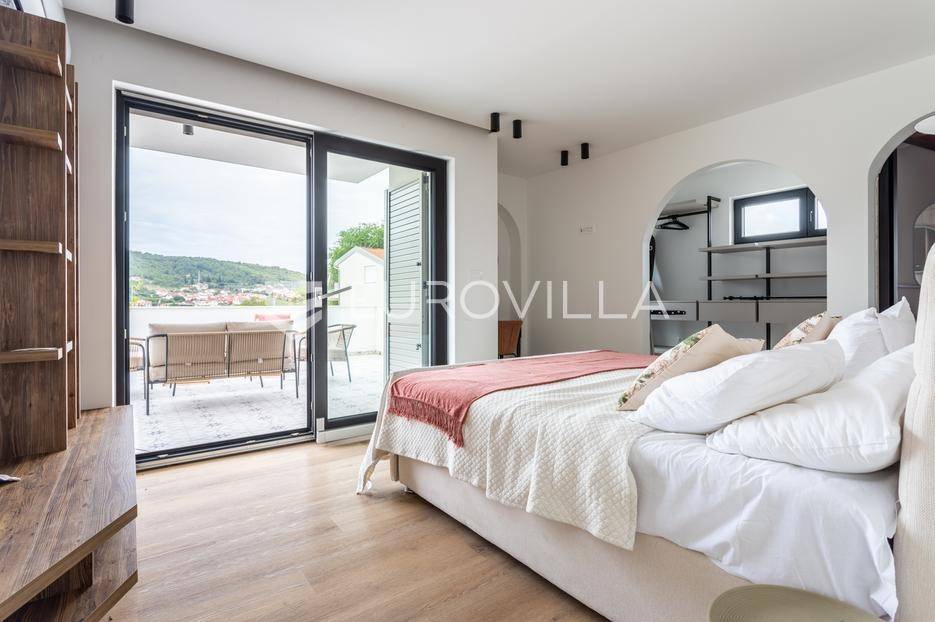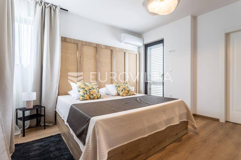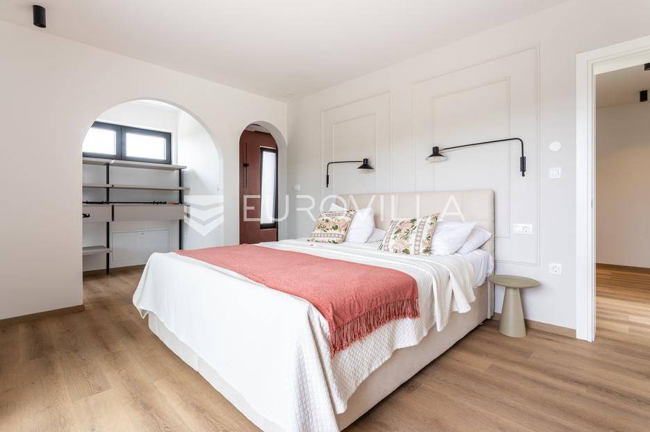 Novoizgrađena vila s bazenom u neposrednoj blizini mora bruto površine 283 m2 na zemljištu površine 1039 m2. Sastoji se od dvije etaže i prostrane okućnice. Na prizemnoj etaži se nalazi kuhinja, blagovaona, dnevni boravak, spremište/tehnička soba, kupaonica te jedna spavaća soba. Na prvoj etaži se nalaze tri spavaće sobe. Master soba posjeduje walk in ormar, kupaonicu te vlastitu prostranu terasu, preostale dvije spavaće sobe dijele zajedničku kupaonicu te svaka od soba ima vlastitu lođu. U dvorištu vile se nalazi natkrivena ljetna kuhinja s kominom, bazen, sunčalište, uređena okućnica te natkriveni i nenatkriveni parking za automobile.Grijanje i hlađenje riješeno putem šest klima jedinica, podnim grijanjem te su postavljeni solarni sistemi.Vila se prodaje u potpunosti namještena, pomno odabranim namještajem od strane dizajnera interijera. Nalazi se prvi red do mora, na samo 20 m od plaže, u blizini svih bitnih sadržaja. Navedeno je čini idealnom za ugodan život ali i za investiciju u svrhe turističkog poslovanja.Više informacija na upit.