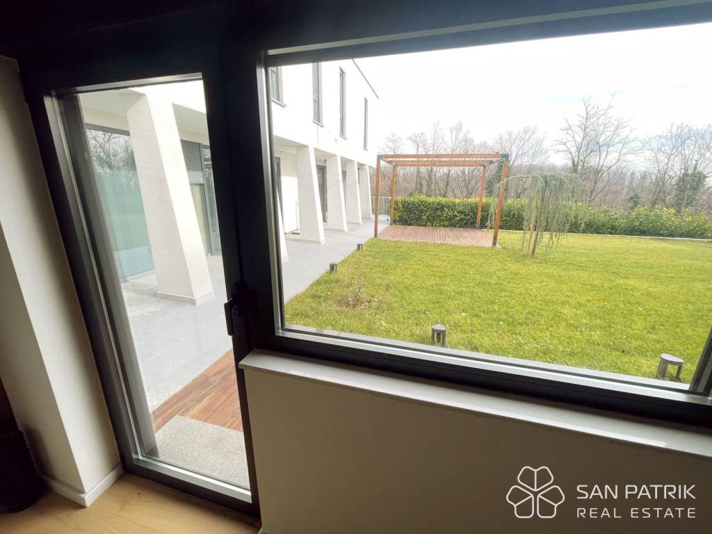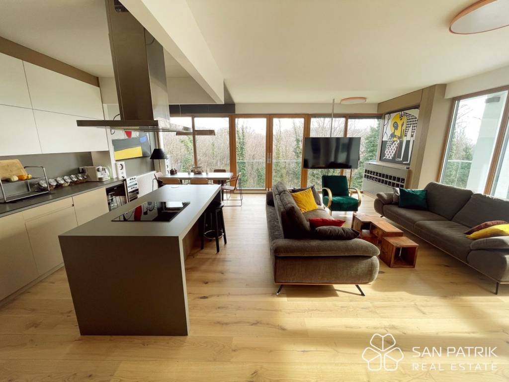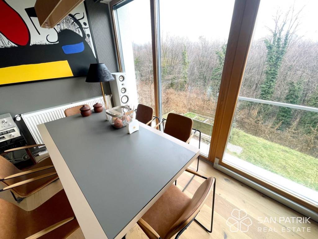 The interior of the apartment reflects sophistication and elegance in every detail. It consists of an entrance hall, a spacious kitchen with a dining area and living room that opens to a covered terrace and a large garden, offering a beautiful view of Jelenovac Forest Park. Additional value to the space is provided by a guest toilet, two smaller rooms with a shared bathroom, a utility room with a wardrobe, a room with a bathroom, and a master room with its own bathroom equipped with a sauna.