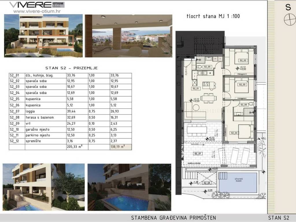 Erleben Sie das Zusammenleben auf eine komplett neue und angenehme Art und Weise. Wir präsentieren Ihnen ein erstklassiges, neues Wohnprojekt bestehend aus sechs komfortablen Wohnungen und einem unglaublichen Penthouse. Die Wohnungen im Erdgeschoss verfügen über einen Garten und einen privaten Pool, während die Wohnungen im ersten und zweiten Stock mit einem Whirlpool auf den großzügigen Terrassen ausgestattet sind. Das Penthouse verfügt über einen Pool auf der Dachterrasse. Zu jeder Wohnung gehört ein Garagenstellplatz und ein Abstellraum im Untergeschoß sowie ein Stellplatz hinter dem Gebäude. Das Wohngebäude ist außerdem mit einem Aufzug ausgestattet, der alle Etagen verbindet. Es muss hervorgehoben werden, dass jede Einheit voll klimatisiert ist durch eingebaute Deckenklimageräte in den abgehängten Decken, Fußbodenheizung mittels Wärmepumpe, die Fußböden werden mit hochwertigem Parkettböden und exzellenten Keramikfliesen verlegt, die Bäder sind mit sanitären Einrichtungen von höchster Qualität ausgestattet, Videoüberwachung, hochwertige ALU-Zimmerei mit elektrischen Jalousien, einbruchsichere Eingangstüren sowie Grill auf den Terrassen. Einzigartig ist nicht nur die moderne Architektur und die hochwertige Ausstattung, sondern auch die Lage der Immobilie. Dieses besondere Fleckchen Erde liegt direkt an der kroatischen Adriaküste. Auf einer kleinen Anhöhe gelegen besitzen alle Wohnungen einen exklusiven Blick über das kristallklare Meer – romantische Sonnenuntergänge inklusive sowie die pittoreske Altstadt der malerischen Ortschaft Primošten. Alle Annehmlichkeiten des täglichen Bedarfs sind bequem zu Fuß erreichbar. Diese ideale Kombination aus moderner Eleganz und mediterraner Tradition an der perfekten Location werden Sie nicht häufig antreffen! Der Baubeginn ist bereits erfolgt, der geplante Einzugstermin ist für Mai 2025 vorgesehen.