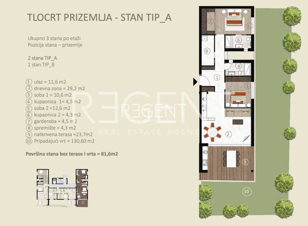 Wir präsentieren Ihnen ein Projekt mit luxuriösen Apartments in einem Wohngebiet von Novigrad, direkt am Meer und anderen Annehmlichkeiten. Novigrad ist gut mit allen Teilen Istriens sowie den Nachbarländern verbunden, und die Autobahn ist nur 5 Autominuten entfernt. Das Gebäude befindet sich am höchsten Punkt von Vidal, umgeben von neuen Gebäuden mit Meerblick. In dieser luxuriösen Wohnanlage befindet sich eine Drei-Zimmer-Wohnung im Erdgeschoss des Gebäudes. Die Wohnung hat eine geschlossene Wohnfläche von 81,6 m2. Mit überdachter Terrasse (11,85 m2), Garten (13,06 m2), Abstellraum (3,53 m2), Parkplatz (2,50 m2) beträgt die Gesamtfläche 112,54 m2. Die Wohnung besteht aus: Flur, Wohnzimmer mit Küche und Esszimmer, zwei Schlafzimmer mit dazugehörigen Badezimmern, Ankleidezimmer, Abstellraum, überdachter Terrasse und Garten. Die Wohnung verfügt über einen Garagenstellplatz und einen Abstellraum. INNENRAUM DER WOHNUNG: Innenraum: Eine Kombination aus Ästhetik, Funktionalität und Komfort. Der moderne Stil ist auf die neuesten Trends in der Innenarchitektur abgestimmt, wobei der Schwerpunkt auf anständigen und unaufdringlichen Details liegt, die mit warmen Farbtönen natürlicher Farben angereichert sind. Kleinere Apartments haben zwei Schlafzimmer und ein Badezimmer, während größere Apartments zwei Schlafzimmer mit Badezimmern und einer separaten Toilette haben. In allen Apartments, unabhängig von der Fläche, ist das Wohnzimmer ein offener Grundriss, der Küche, Esszimmer und Wohnzimmer zu einer Einheit mit Zugang zu einer geräumigen Terrasse verbindet. Neben dem Komfort wird auch der Sicherheit des Gebäudes große Aufmerksamkeit geschenkt. Alle Apartments verfügen über eingebaute Sicherheits- und Brandschutztüren, während die Aluminiumfenster mit Dreifachverglasung über automatische Rollläden und Jalousien auf den Loggien verfügen. Die Kombination aus traditionellen Materialien und modernem Design vermittelt einen Eindruck von Luxus, der durch Details wie hohe Decken, hochwertige Badkeramik, elegante „Filomuro“-Innentüren und großformatige Parkettböden aus Holz unterstrichen wird. Ein solcher Innenraum, in natürlicher Textur und warmen Farbtönen, strahlt unaufdringlich einen herzlichen Empfang aus, während saubere und gerade Linien mit großen Glasflächen die Geräumigkeit zusätzlich betonen. Die Fertigstellung des Baus wird im Jahr 2025 erwartet.