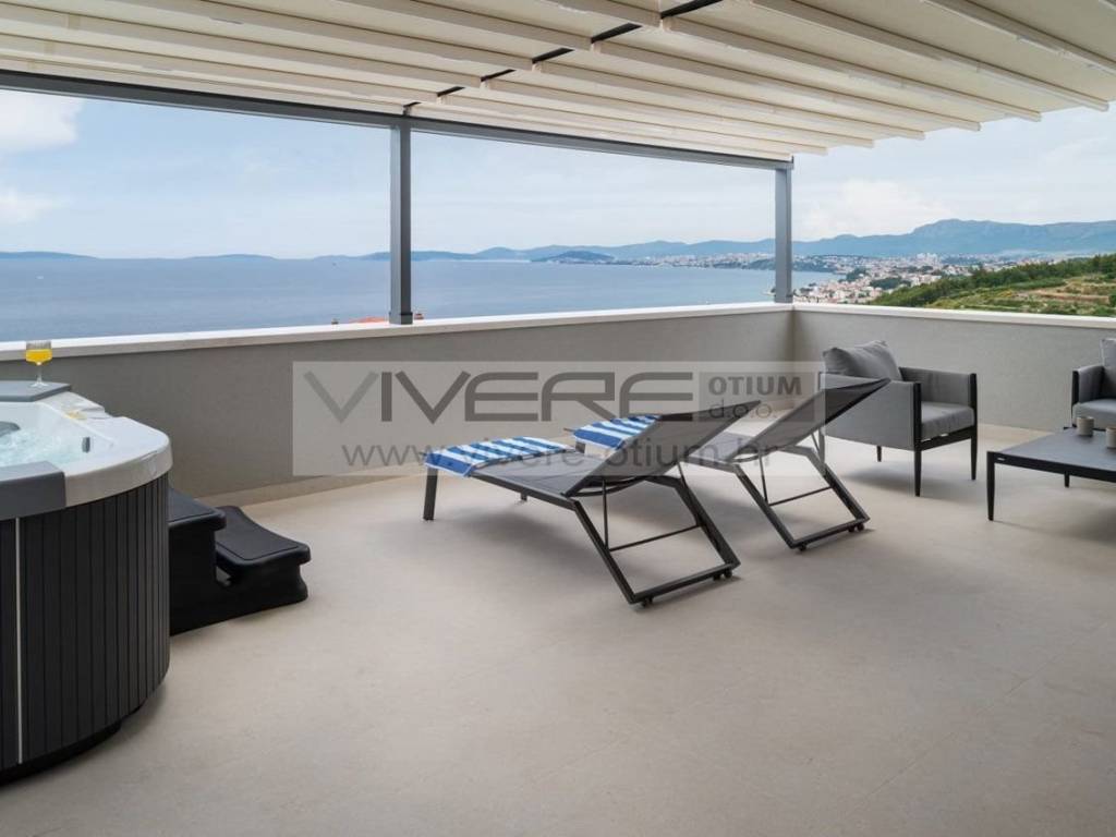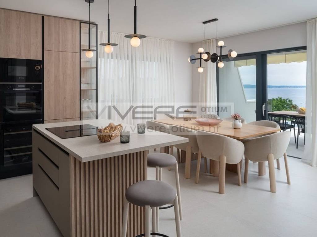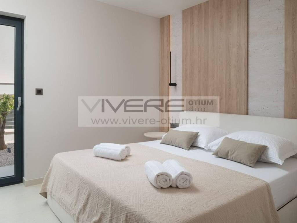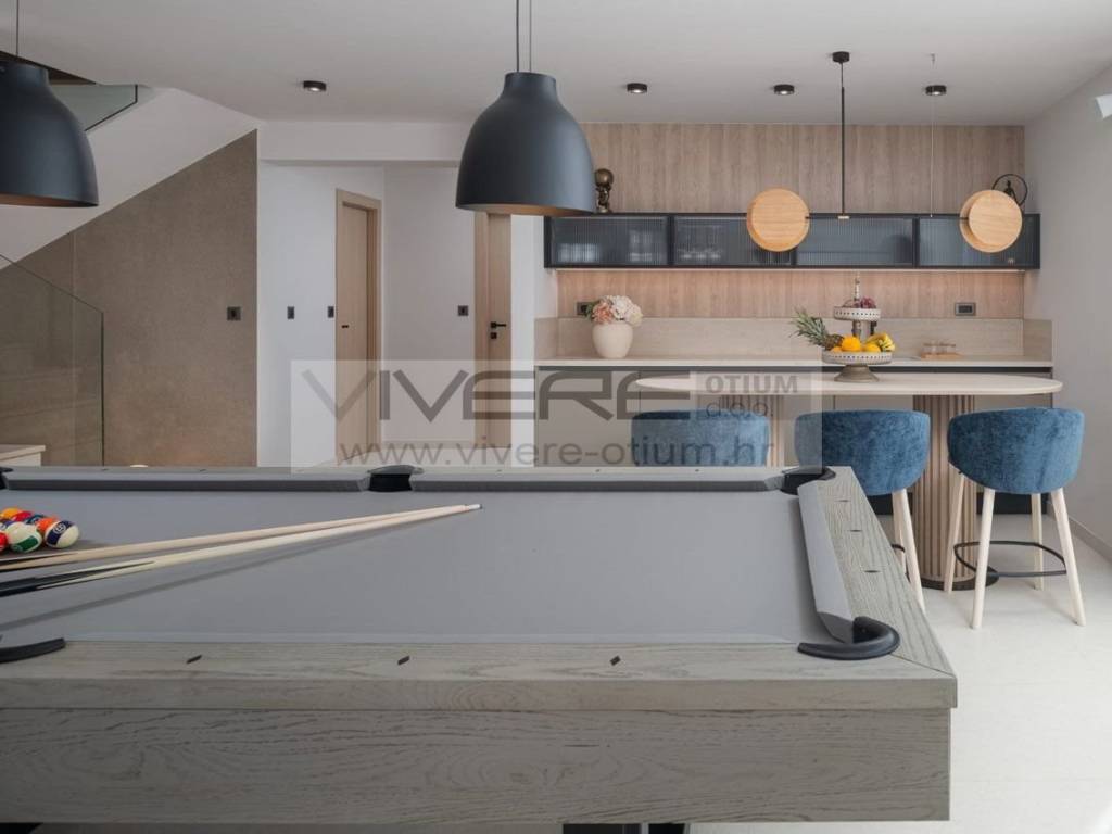 Diese beeindruckende, neue Villa befindet sich auf einem 600 m² großen Grundstück und erstreckt sich über 320 m² Wohnfläche, verteilt auf drei Etagen. Sie bietet ein modernes und einladendes Innendesign mit viel natürlichem Sonnenlicht. Der offene Grundriss öffnet sich visuell zur unberührten Adria hin und lädt Sie dank großer Glasflächen, die eine unglaubliche Aussicht bieten, ein, den mediterranen Lebensstil zu genießen. Im offen konzipeirten Erdgeschoß befinden sich das gemütliche Wohnzimmer, welches mit der Küche und dem Essbereich verbunden ist. Darüber hinaus bietet das Erdgeschoss zwei Schlafzimmer und zwei Badezimmer. Vom Wohnbereich und der Küche haben Sie direkten Zugang zur überdachten Terrasse und zum gemütlichen Lounge-Bereich am Infinity-Pool. Entspannen Sie am privaten, beheizbaren Pool mit Ihren Lieblingsgetränk und lassen Sie den Duft von mediterranen Pflanzen und Bäumen all Ihre Sinne berauschen. Die erste Etage bietet zwei weitere Schlafzimmer und zwei Badezimmer sowie eine Waschküche. Im vorderen, dem Meer zugewandten Bereich des Obergeschosses befindet sich ein offener Bereich mit kleiner Küche und Bar, der sich zur großzügigen Terrasse hin öffnet. Das Highlight dieser Etage ist die großzügige Süd-West-Terrasse, die mit Whirlpool und Lounge-Möbeln zum Entspannen ausgestattet ist. Und gibt es eine bessere Möglichkeit, einen perfekten Tag ausklingen zu lassen, als im sprudelnden Whirlpool bei einem Glas Champagner den Panoramablick auf das Meer und romantische Sonnenuntergänge zu genießen. Die größte Überraschung erwartet Sie im Souterrain der Villa: ein großer Unterhaltungsbereich für gesellige Zusammenkünfte, ausgestattet mit Billard, einer Bar und einer Lounge-Ecke, von der aus Sie auf den großen Fernsehbildschirm bequem Sportereignisse verfolgen oder Videospiele spielen können. Das Untergeschoss verfügt außerdem über einen privaten Wellnessbereich, ausgestattet mit Sauna, Dusche und separater Toilette. Die Immobilie ist voll klimatisiert und komplett möbliert. Zur Immobilie gehören auch eine Garage und zwei Außenstellplätze.