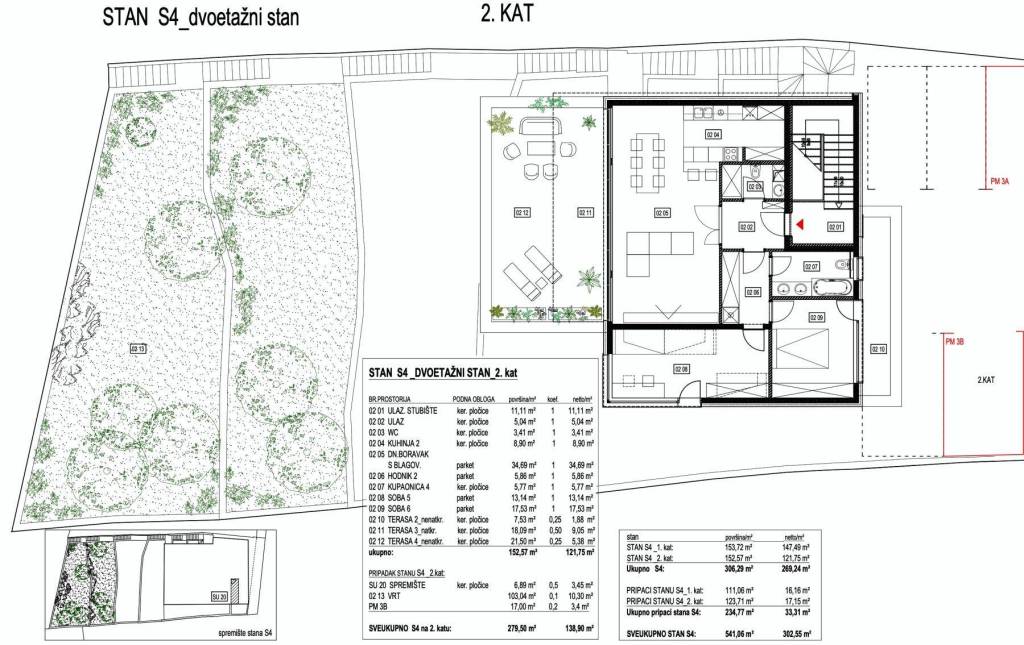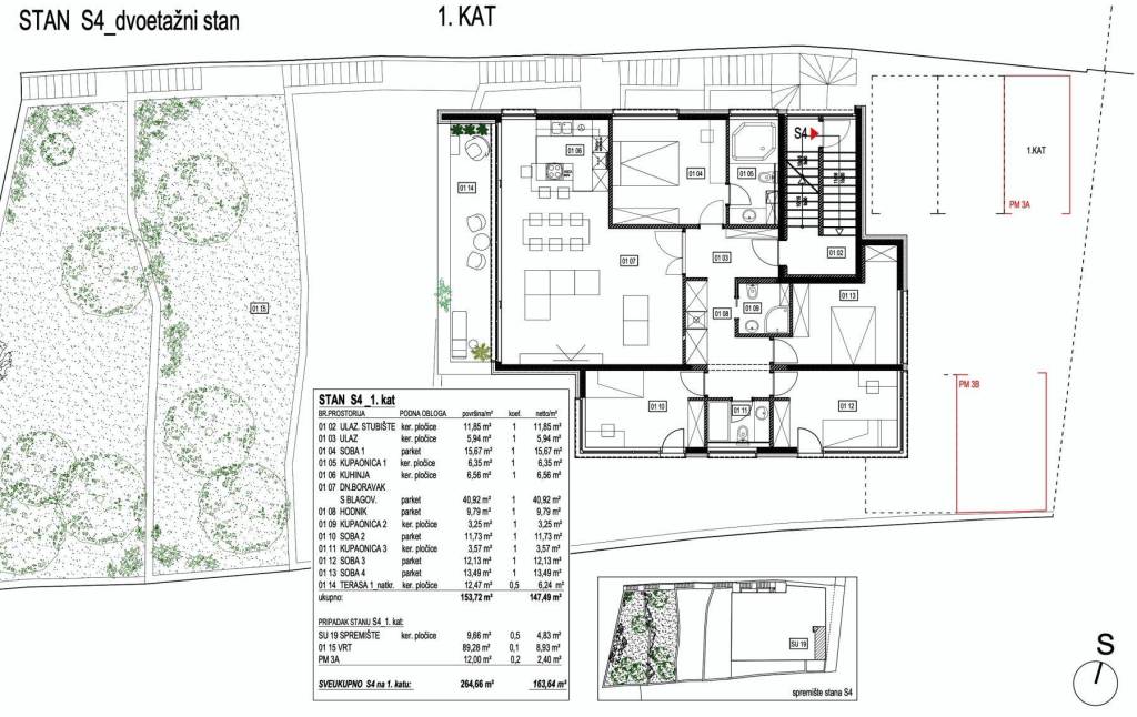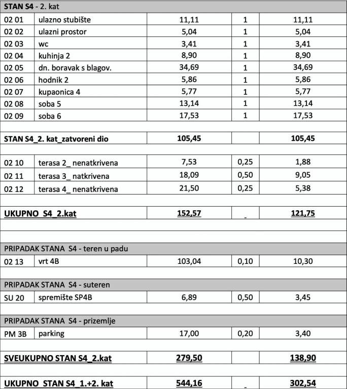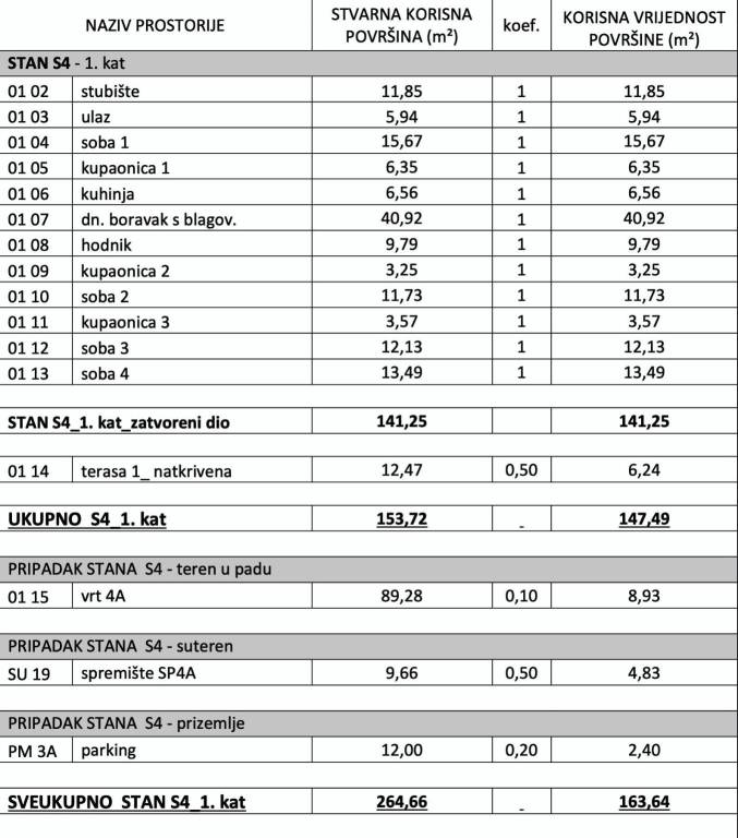 Apartment S-04 – duplex (1st and 2nd floor) – living area of 246.69 m² (6 bedrooms + 4 bathrooms + WC) + 2 covered terraces (12 and 18 m²) + 2 uncovered terraces (7 and 21 m²) + garden (192 m² - West) + 2 storage rooms (10 and 7 m²) + 2 outdoor parking spaces, net area of 302.55 m² = 1,300,965 EUR