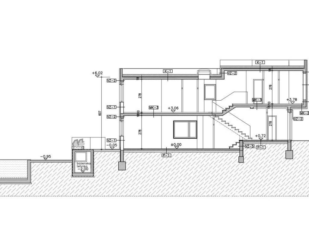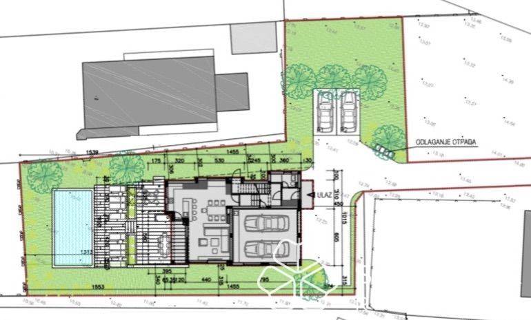 The house consists of a ground floor and a first floor with a wonderful view of the sea and the rest of the island. On the ground floor there is an entrance area, bathroom, living room with kitchen and dining room, covered and uncovered terrace, swimming pool and garage for two cars. In addition to the garage, the house also offers two additional outdoor parking spaces. On the first floor of the house there are 3 corridors, 4 bedrooms (23.79m2 + 17.74m2 + 14.48m2 + 13.68m2), 3 bathrooms and a covered balcony.