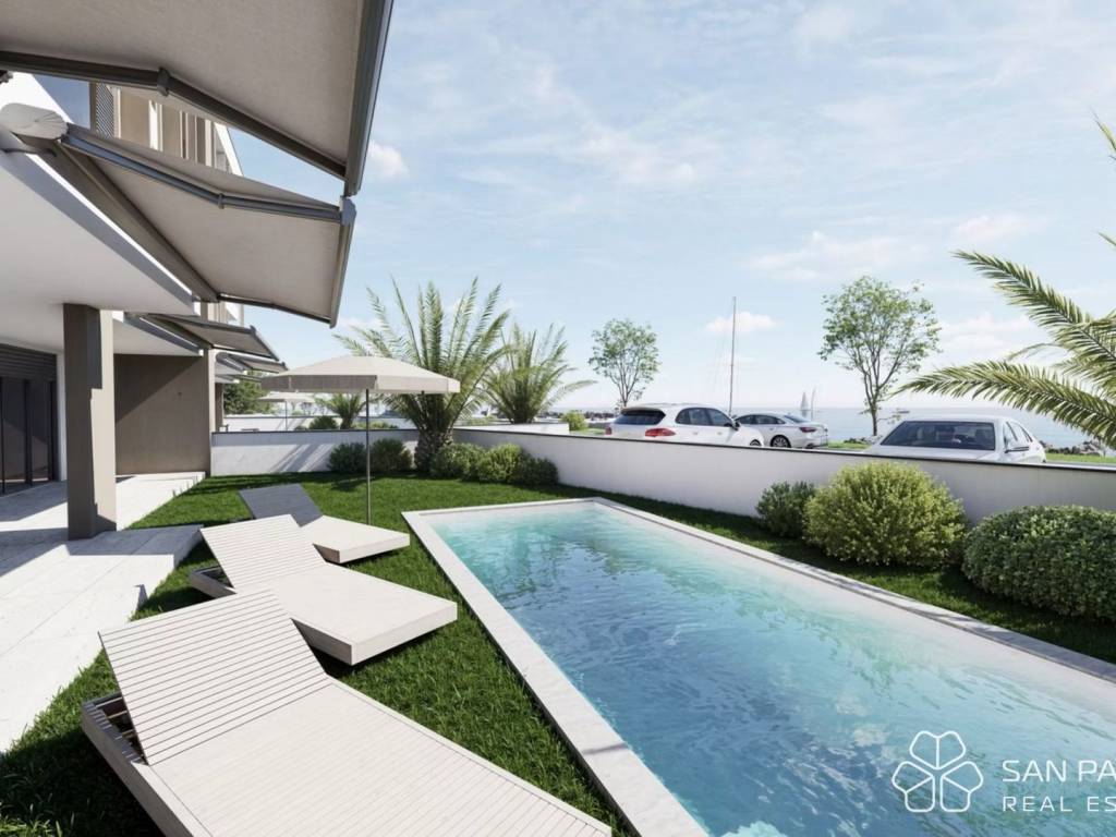 Apartment S-1A – ground floor – living area 129.77 m² (3 bedrooms + 3 bathrooms + WC) + 2 covered terraces (46 m²) + pool (24 m²) + front and rear garden (75 + 72 m²) + storage (5 m²) + two outdoor parking spaces no. 7 and 8; net calculated area 229.12 m² = EUR 1,615,000.00