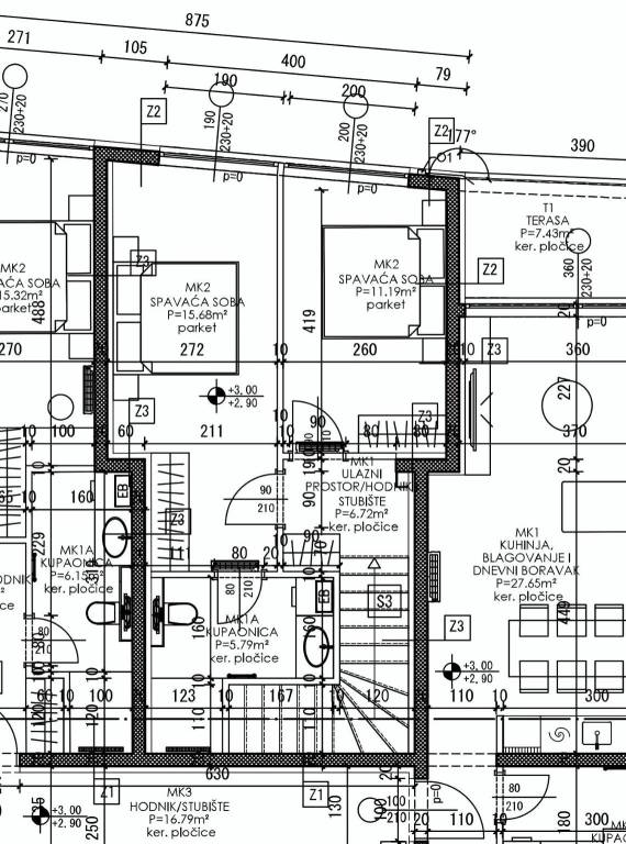 Apartment S-03 – Duplex (Ground floor + 1st floor) – living space 78.79 m² (2 bedrooms + 2 bathrooms) + terrace (17.94 m² x 0.2 = 3.59 m²) + garden (8.03 m² x 0.1 = 0.80 m²) + outdoor parking PM3 (12.50 m² x 0.2 = 2.5 m²); total net area: 85.68 m² = 481,950 EUR