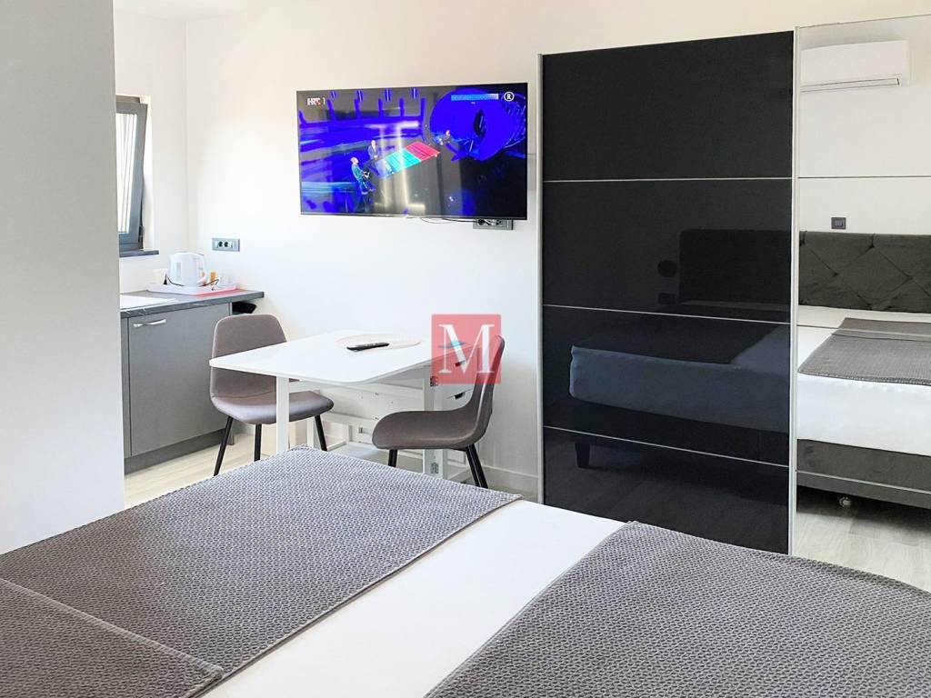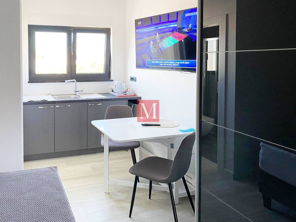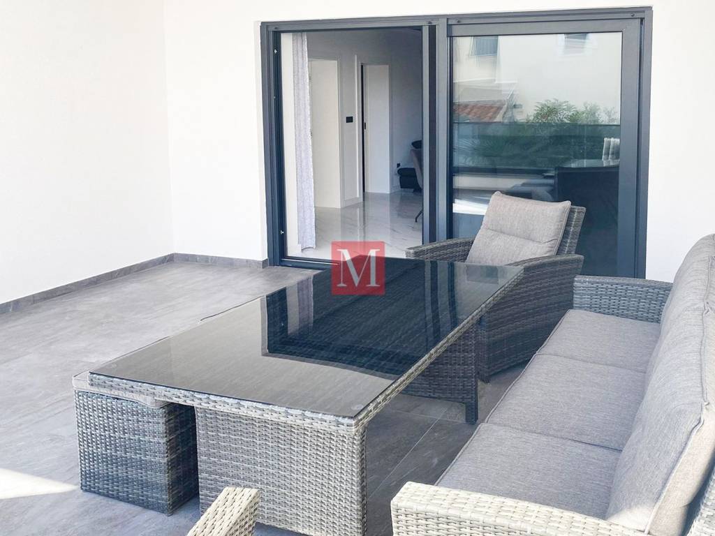 The interior consists of two bedrooms, a bathroom, a modern kitchen with a dining room and a living room, and a large terrace. On the same floor there is also a studio apartment with its own entrance.