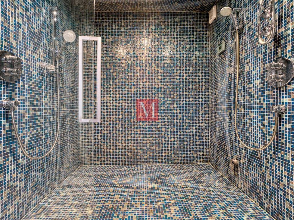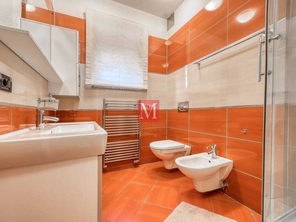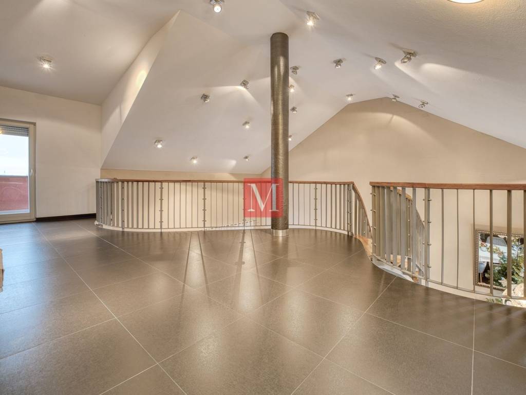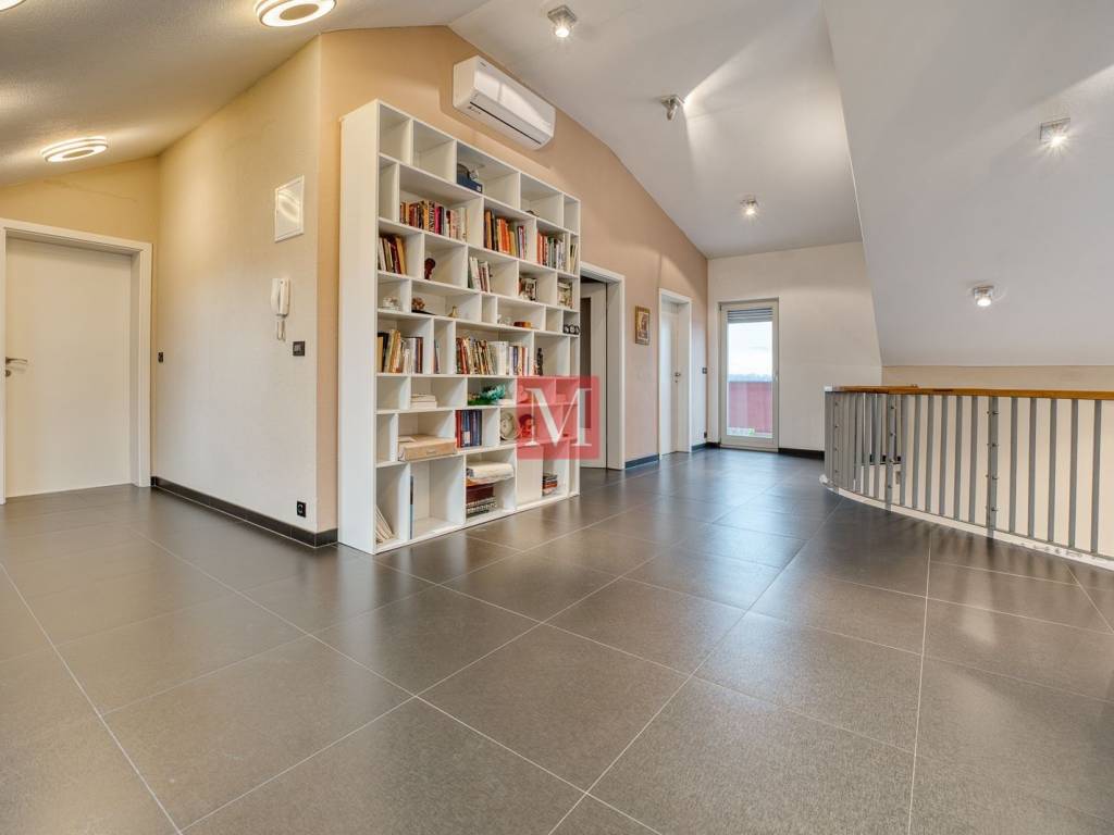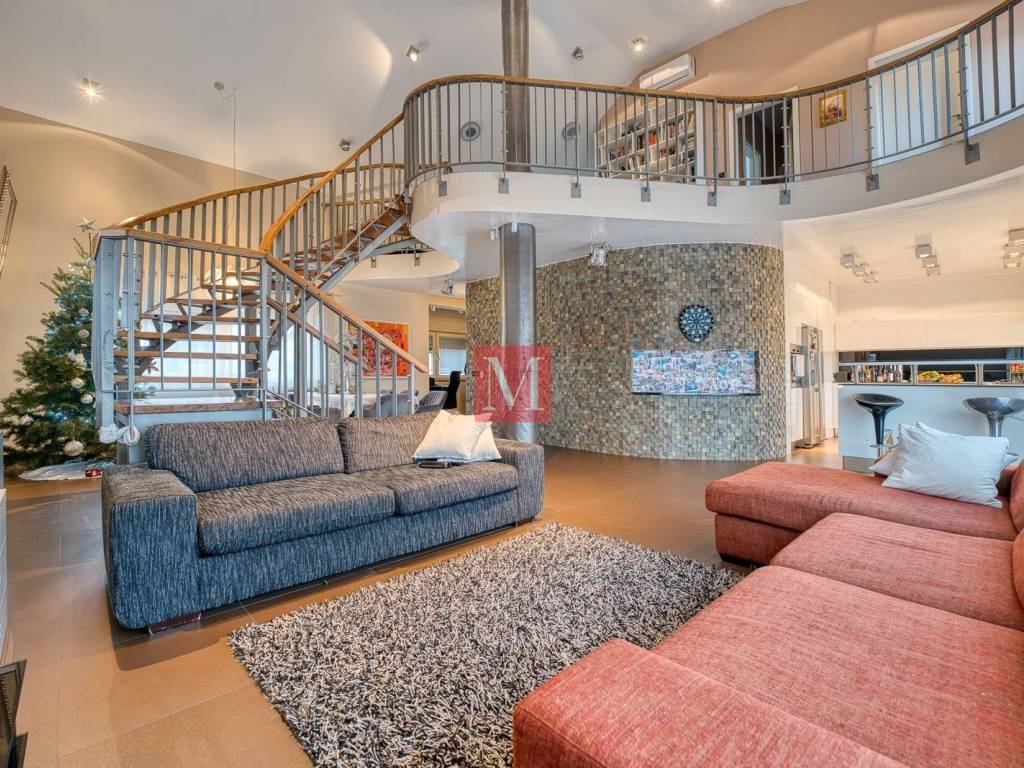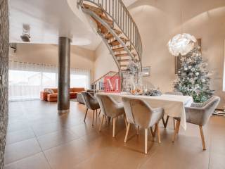 1st floor (lower floor of the duplex apartment) entrance hall, guest toilet, large open-space living room connected to the kitchen and dining room with access to the terrace and a large walk-in closet that separates the master bedroom with a large private bathroom from the previous one;