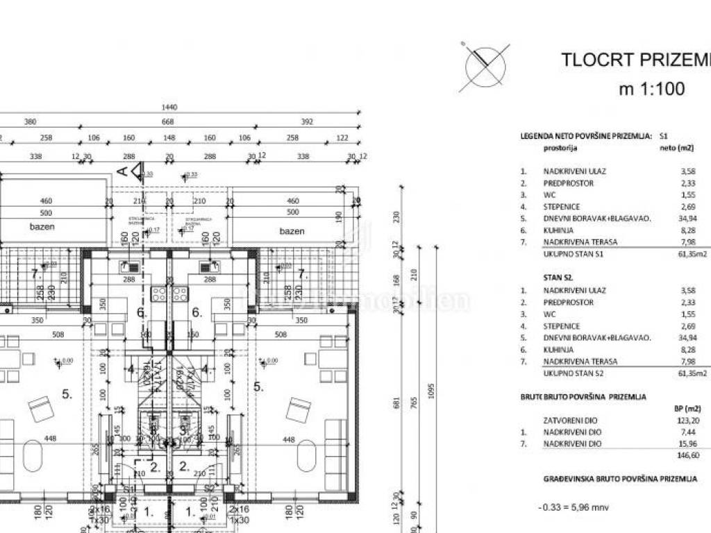 S1 - ERDGESCHOSS (Eingang (2,33 m2), Toilette (1,55 m2), Treppe (2,69 m2), Wohnzimmer + Esszimmer (34,94 m2), Küche (8,28 m2), Terrasse (7,98 m2) und Swimmingpool)