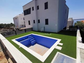 Auf der Südseite der Insel Pag, etwa 10 km vom berühmten Strand Zrce entfernt, befindet sich diese schöne Wohnung. Es hat eine schöne Aussicht auf das Meer und die Inseln. Der Ort ist perfekt für diejenigen, die einen ruhigen Urlaub in einer wunderschönen natürlichen Umgebung verbringen möchten. Die Wohnung befindet sich im ersten Stock. Es besteht aus einem Wohnzimmer, Küche und Esszimmer, drei Schlafzimmern, jedes mit eigenem Bad und Waschküche. Ein Zimmer öffnet sich auf eine Loggia, während sich das andere Zimmer und das Wohnzimmer auf eine überdachte Terrasse öffnen. Die Wohnung hat auch einen Garten mit Swimmingpool und einen Parkplatz. Fußbodenheizung ist in allen Räumen außer den Schlafzimmern. Klimaanlagen sind in jedem Zimmer. Ausgezeichnete Immobilie, gebaut und ausgestattet mit den hochwertigsten Materialien. Gelegenheit!