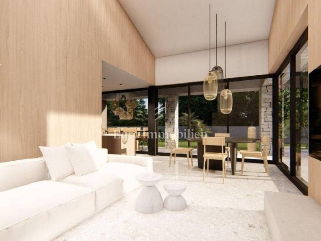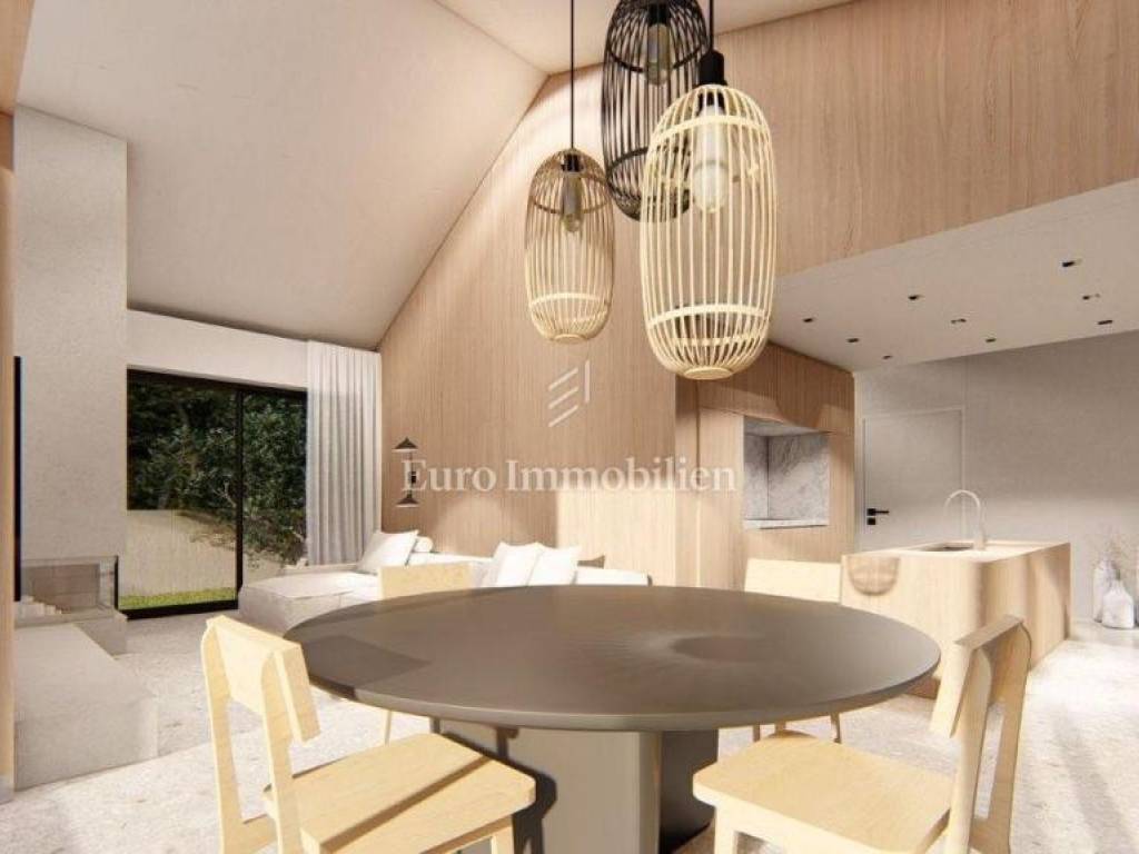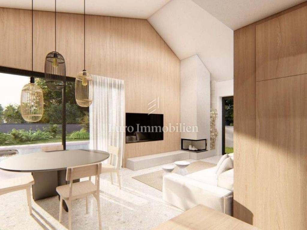 Das Wohnzimmer führt auf die Terrasse und davor gibt es einen Swimmingpool und einen großen Garten. Im Dachgeschoss befindet sich ein Abstellraum.