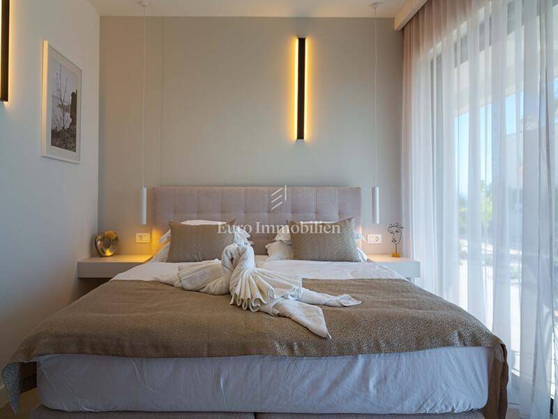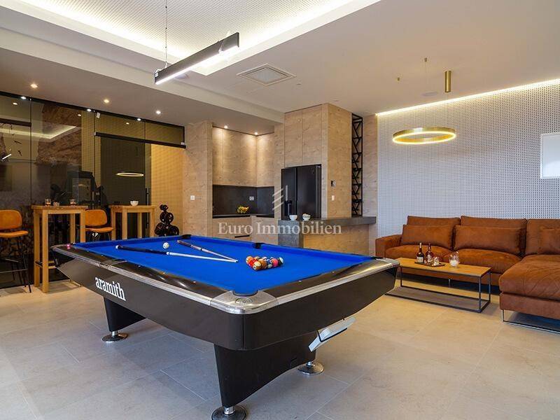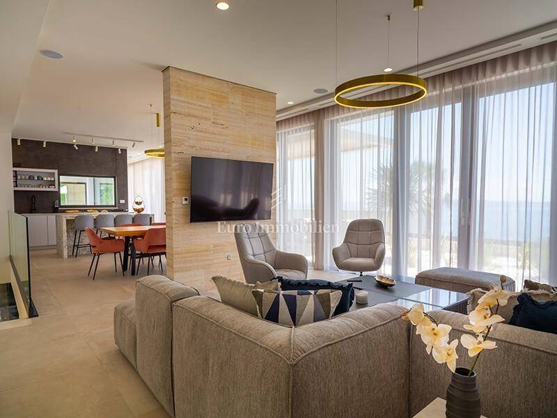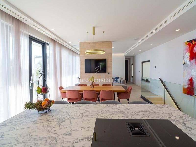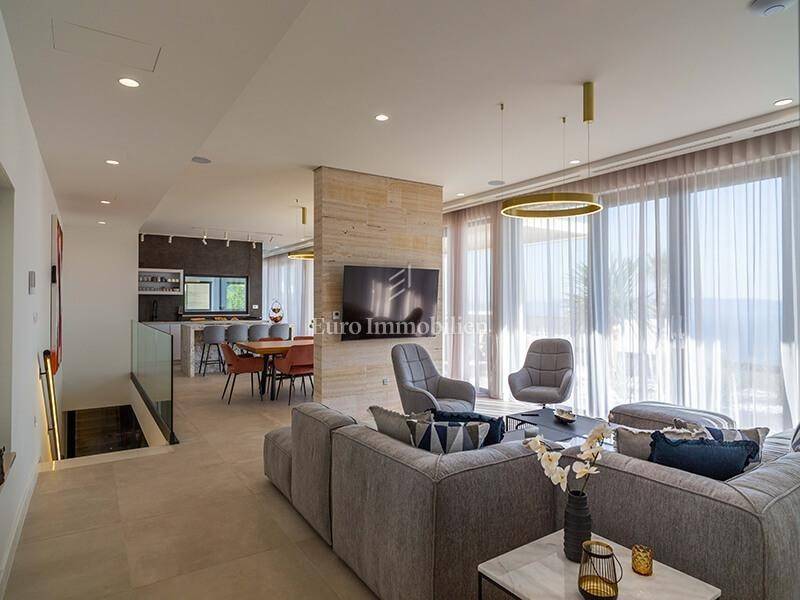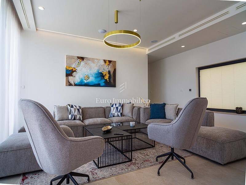 Die Villa ist komplett mit neuen Luxusmöbeln ausgestattet und wird als solche verkauft. Das Projekt umfasst hochwertige Materialien, eingebaute Glaswände mit dreifach verglasten Fenstern, PVC-Tischlerei mit elektrischen Rollläden, hochwertige Bodenbeläge, Keramikfliesen mit installierter Fußbodenheizung, voll ausgestattete Badezimmer, eine Fassade mit überlegener Wärmedämmung und Schalldämmung, Klimaanlage in jedem Zimmer, Glasgeländer auf den Balkonen, Stein auf der Terrasse im Erdgeschoss, TV und Internetanschluss.