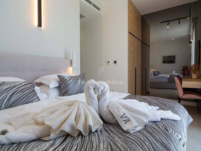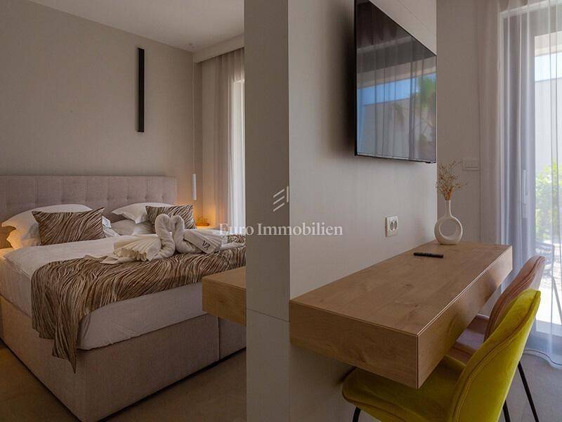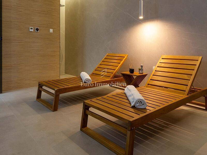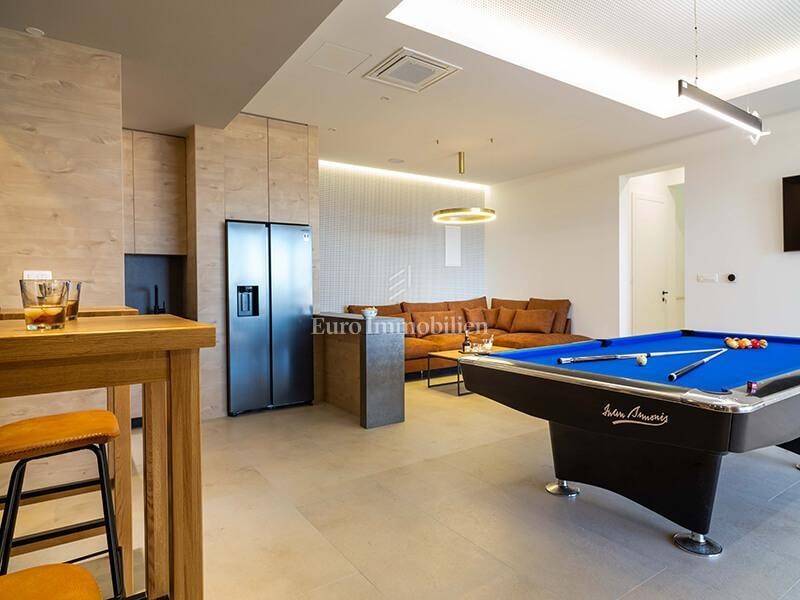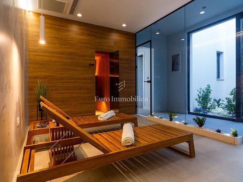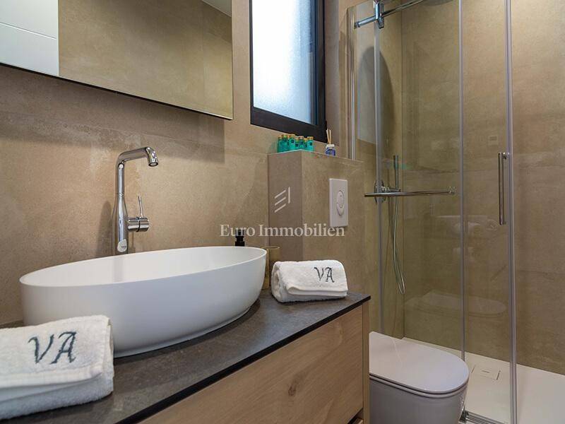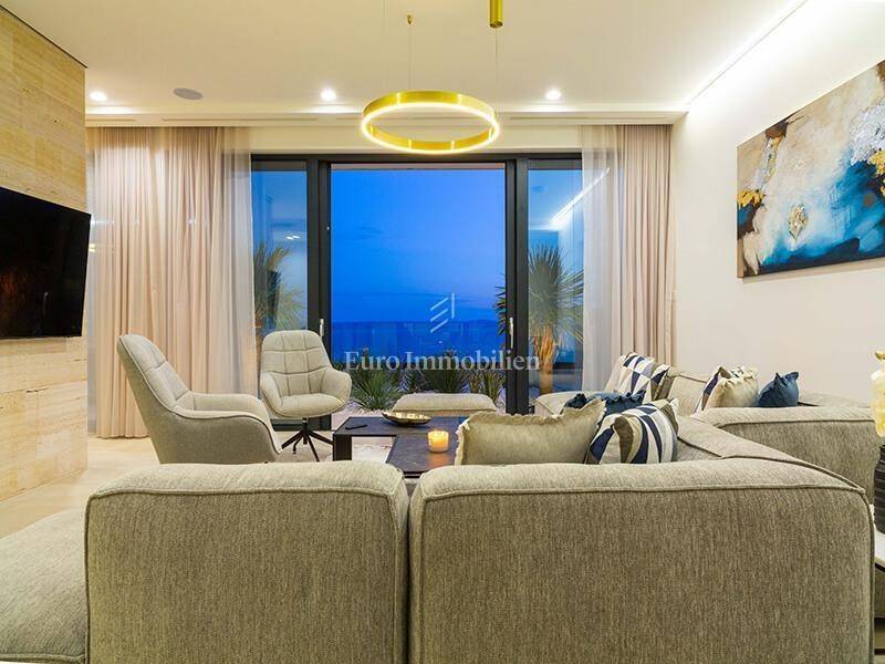 Die Villa ist komplett mit neuen Luxusmöbeln ausgestattet und wird als solche verkauft. Das Projekt umfasst hochwertige Materialien, eingebaute Glaswände mit dreifach verglasten Fenstern, PVC-Tischlerei mit elektrischen Rollläden, hochwertige Bodenbeläge, Keramikfliesen mit installierter Fußbodenheizung, voll ausgestattete Badezimmer, eine Fassade mit überlegener Wärmedämmung und Schalldämmung, Klimaanlage in jedem Zimmer, Glasgeländer auf den Balkonen, Stein auf der Terrasse im Erdgeschoss, TV und Internetanschluss.