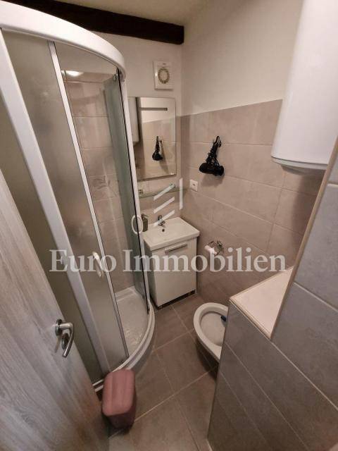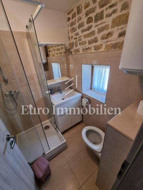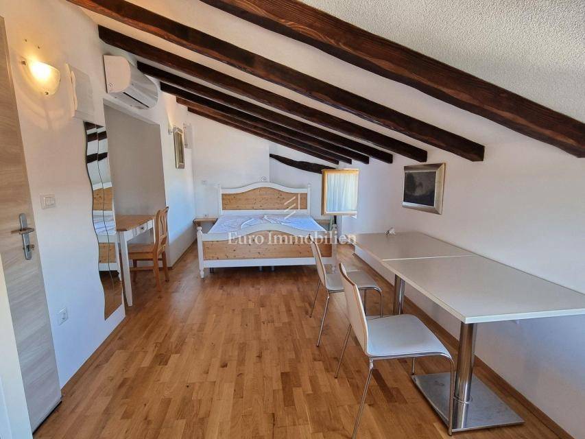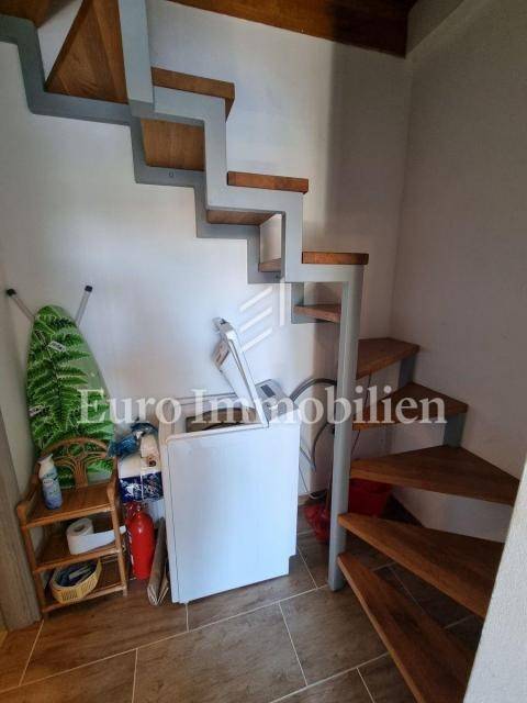 Auf der Rückseite des Hauses befindet sich eine kleine Wohnung mit separatem Eingang. Das Erdgeschoss verfügt über eine große Terrasse, ein Wohnzimmer, ein Esszimmer und eine Küche, alles in einem Raum. Das Schlafzimmer und das Badezimmer befinden sich im Obergeschoss.
