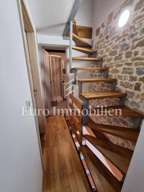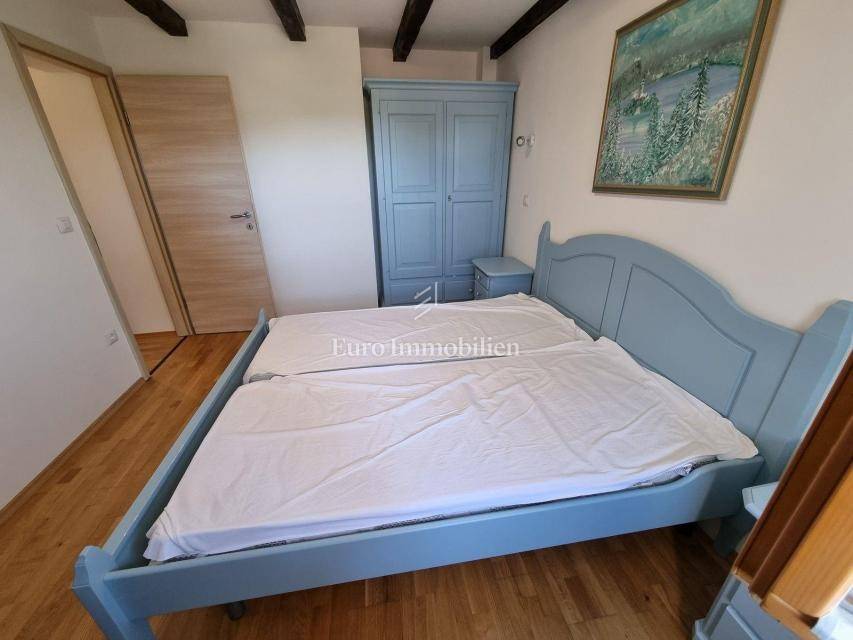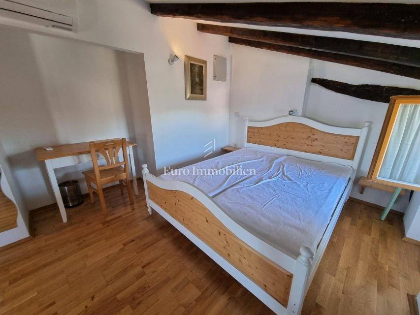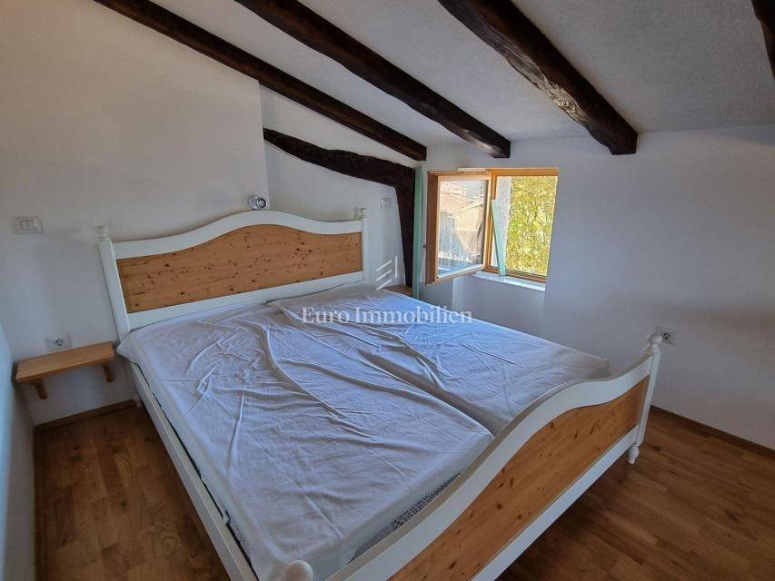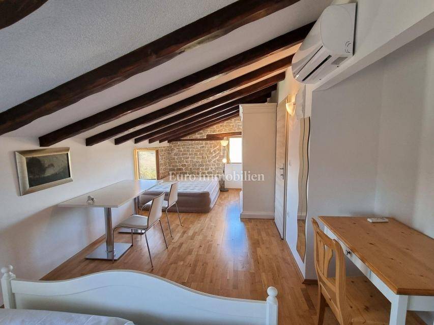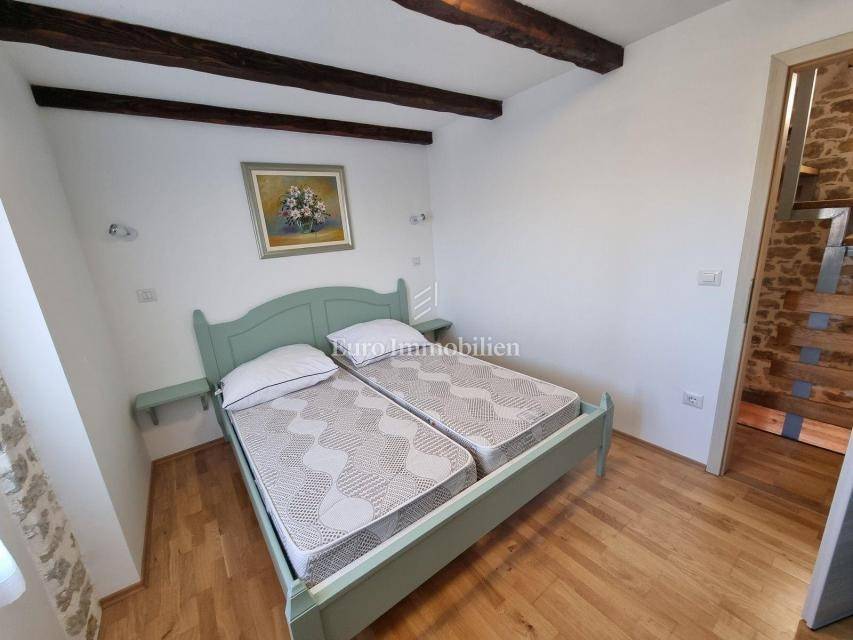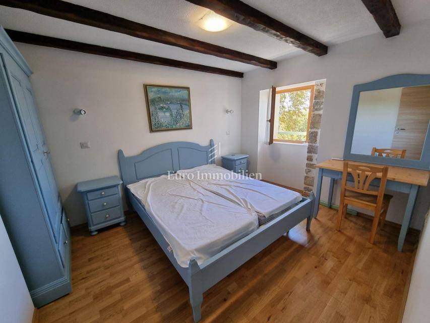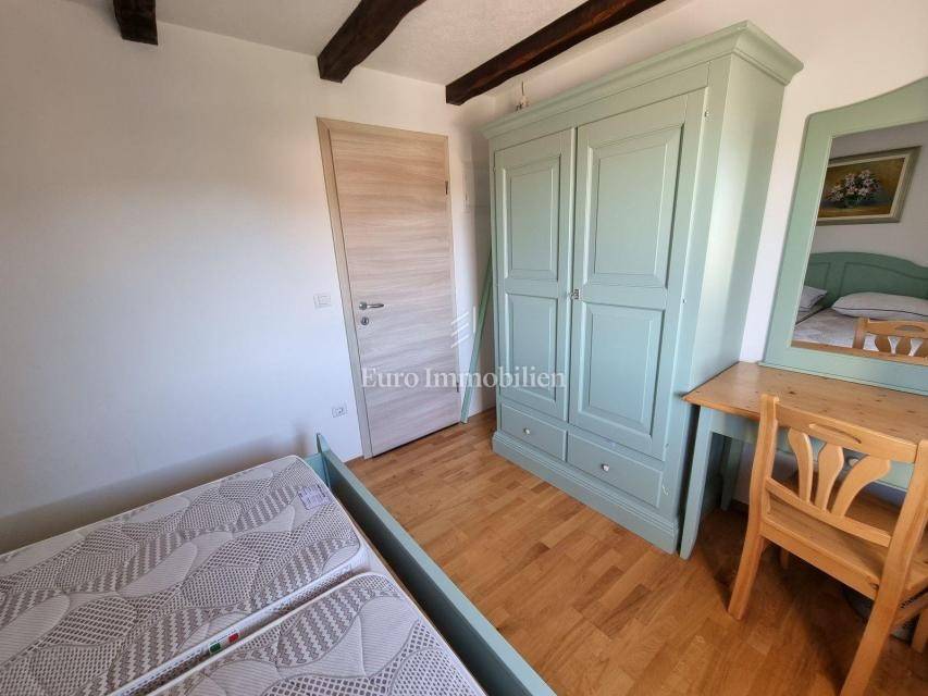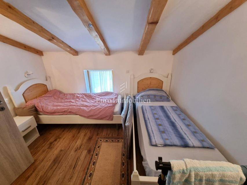 Die Immobilie besteht aus einem Haus und einer kleinen Wohnung im hinteren Teil.Das Haupthaus verfügt über einen eigenen Garten, Pool, Terrasse, Parkplatz und besteht aus das Erdgeschoss, Obergeschoss und Dachgeschoss. Im das Erdgeschoss befindet sich ein Wohnzimmer, ein Esszimmer und eine Küche, sowie eine Toilette. Die Treppe führt in den ersten Stock, wo sich zwei geräumige Schlafzimmer mit Blick auf Motovun befinden, zusammen mit ein gemeinsames Badezimmer . Im oberen Dachgeschoss befindet sich ein großes Schlafzimmer und ein Badezimmer,auch mit wunderschöne Aussicht auf Motovun.