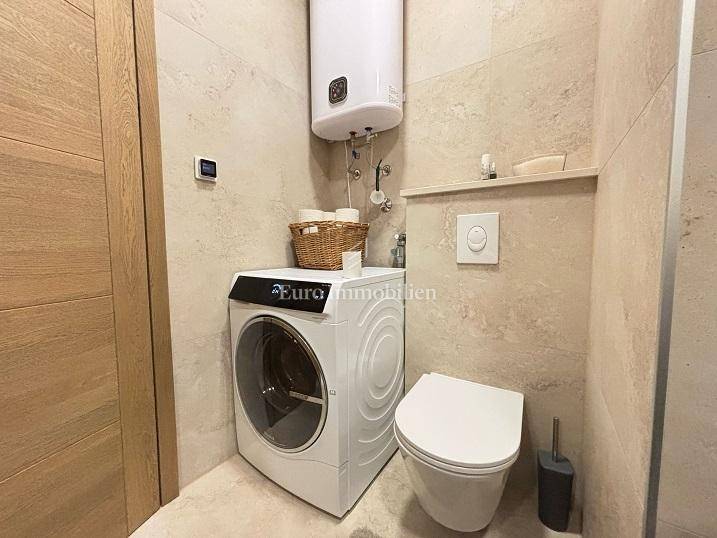 Es besteht aus einem Flur, einem Wohnzimmer mit Küche und Esszimmer, 2 Schlafzimmern und einem Badezimmer mit WC. Vor der Wohnung befindet sich eine überdachte Terrasse mit Pergola, außerdem verfügt sie über einen kleinen Abstellraum unter der Treppe. Privater Garten von 89 m2 und zwei überdachte Parkplätze. Den Strand und das Zentrum von Novalja erreichen Sie in etwa 10 Gehminuten.