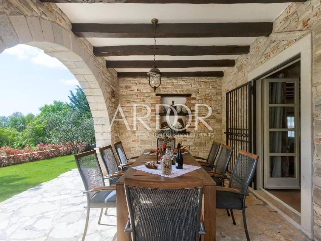 Istrien, wir vermitteln den Verkauf einer bezaubernden Luxus-Steinvilla in der Nähe von Tinjan. Dieser kleine und charmante Ort liegt nur wenige Minuten von der Hauptstraße, 15 Minuten von Poreč und 25 Minuten von Rovinj entfernt, einer der schönsten und meistbesuchten kroatischen Städte. Die Steinvilla besteht aus dem Erdgeschoss und der ersten Etage und verfügt über insgesamt 280 m2. Die Fläche des gesamten Grundstücks beträgt 1112 m2.
