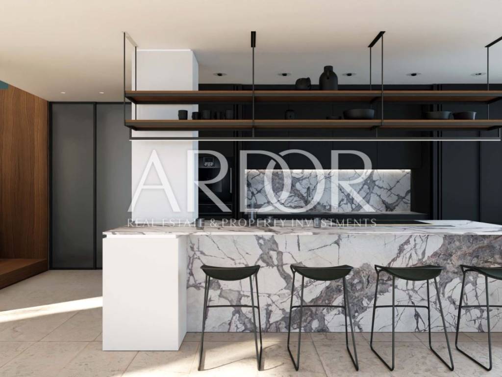 Der Wohnbereich befindet sich im Erdgeschoss und ersten Stock. Im Erdgeschoss gibt es ein geräumiges, offenes Wohnzimmer mit Küche und Essbereich sowie ein zusätzliches Zimmer, das als Büro oder Schlafzimmer genutzt werden kann. Eine große elektrische Glasschiebetür bietet einen Panoramablick aus dem Wohnzimmer, während der Außenbereich mit einem 30 m² großen Pool mit Gegenstromanlage, einer Sonnenterrasse und einer Außenküche mit Essbereich ausgestattet ist.