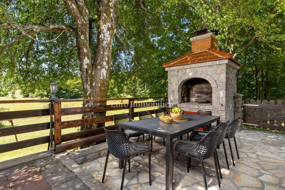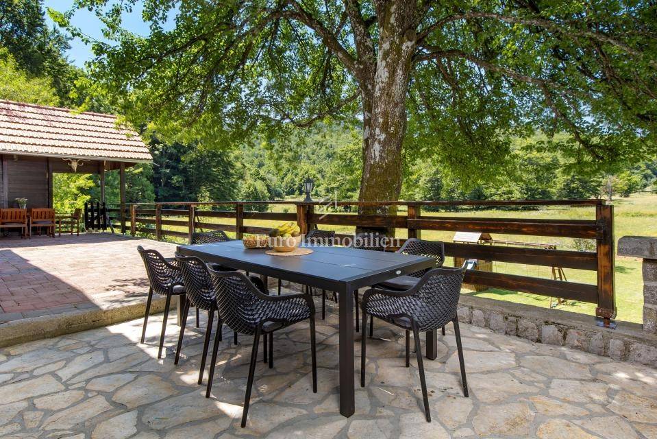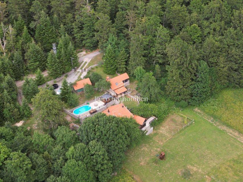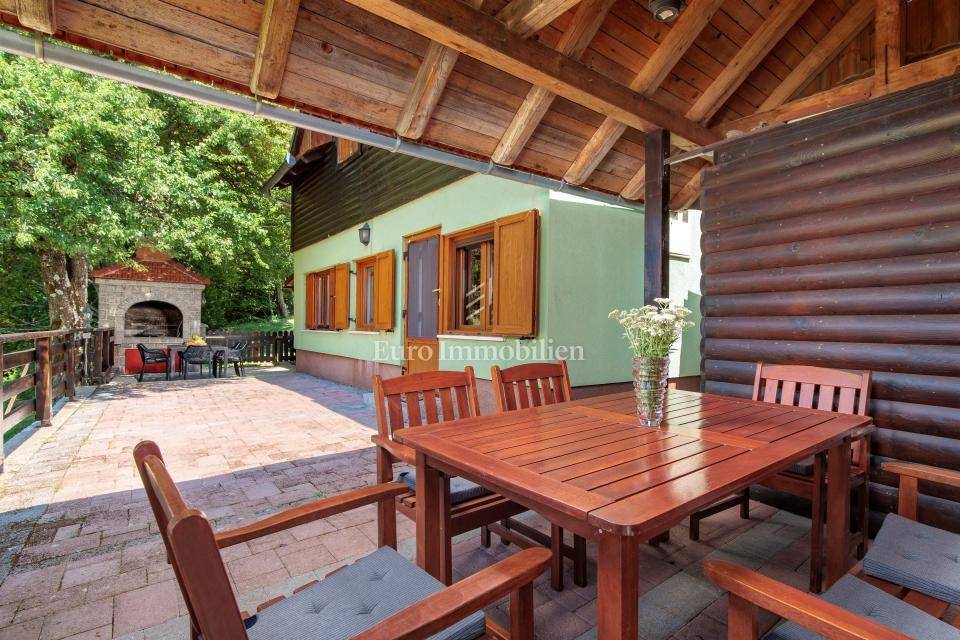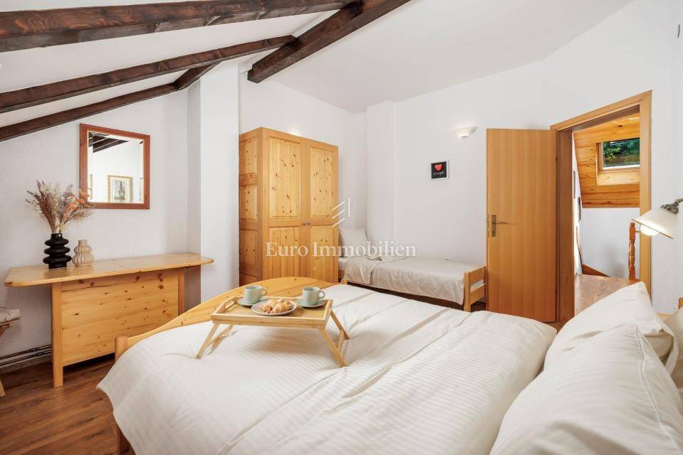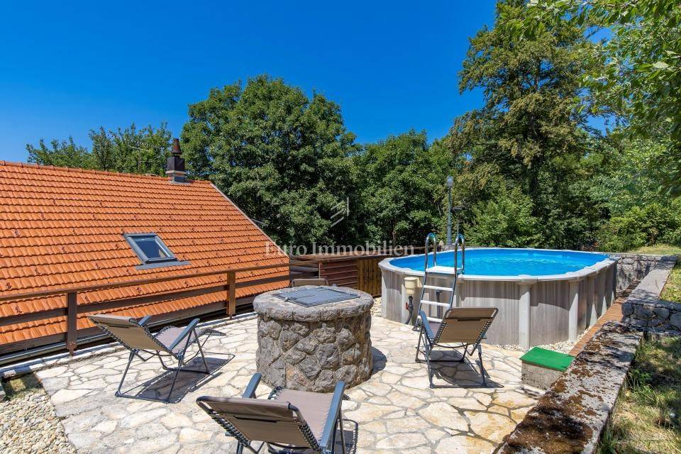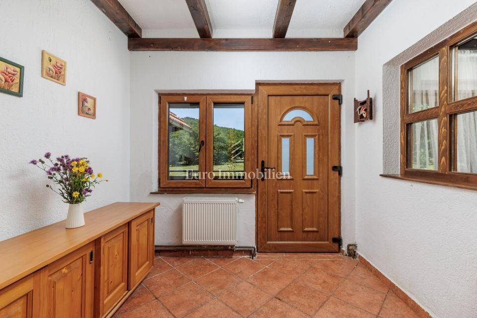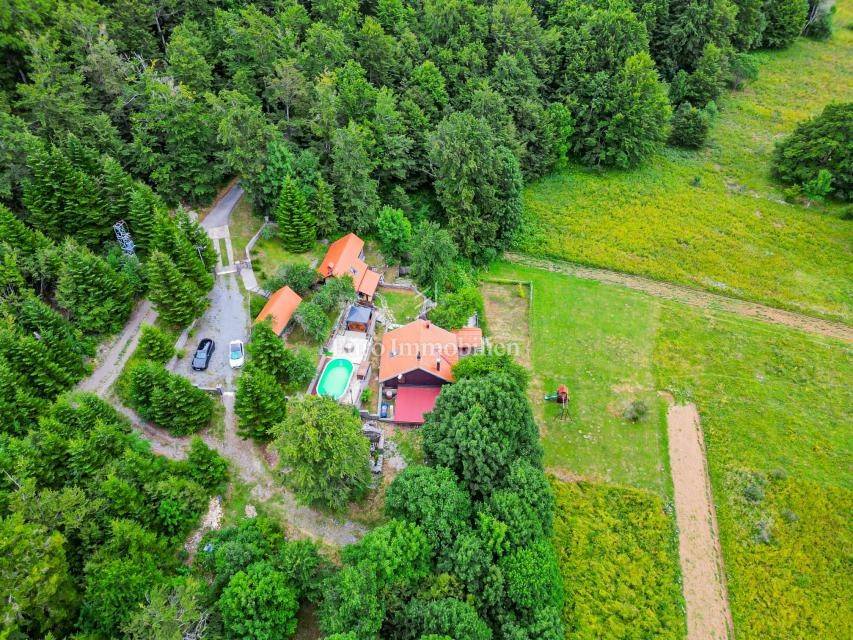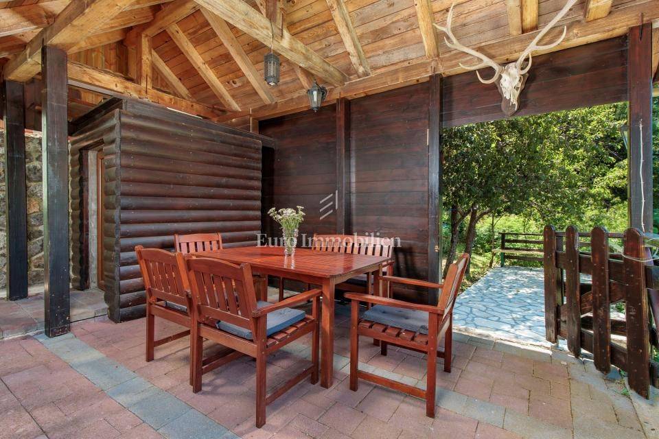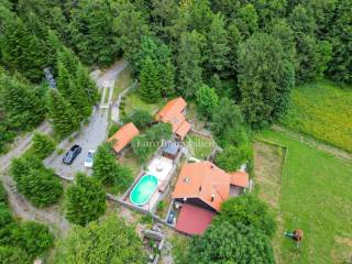 Ein kleines Nebengebäude dient als zusätzliche Unterkunft oder für weitere Zwecke. Der terrassenförmig angelegte Garten verfügt über Pool, Sonnendeck, Grillplatz, Leseecke im Freien und Kinderspielplatz. Großzügiger Parkplatz und Wiese im Wald bieten Ruhe und Privatsphäre.