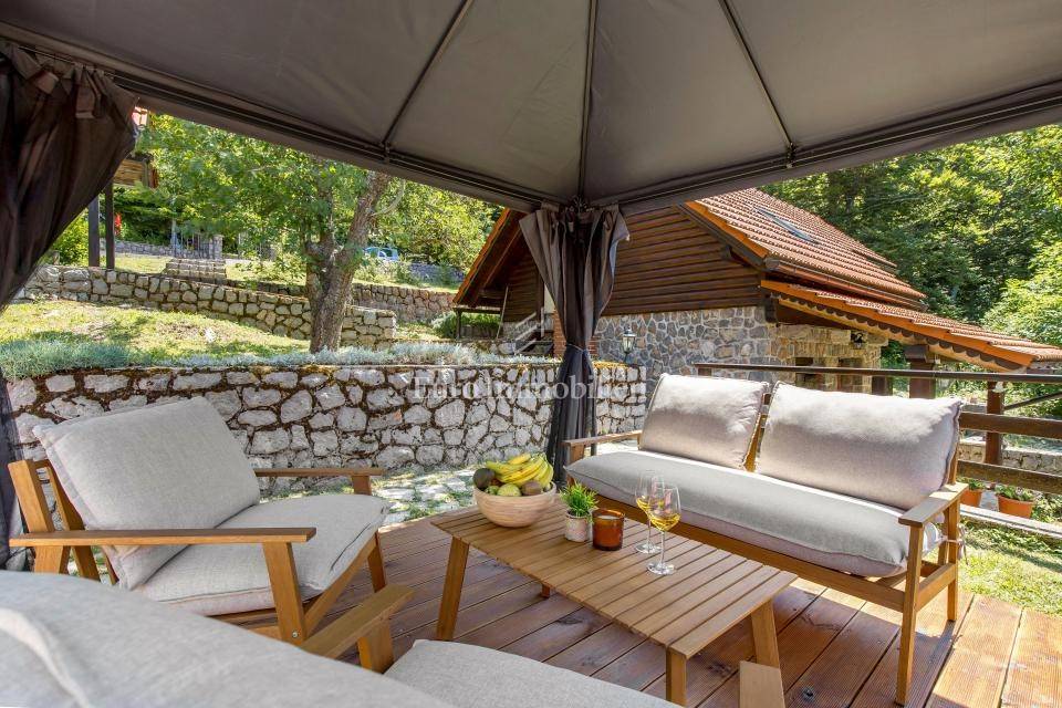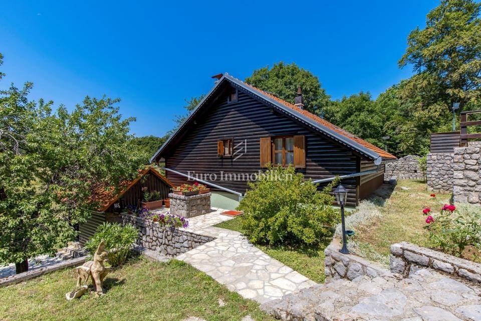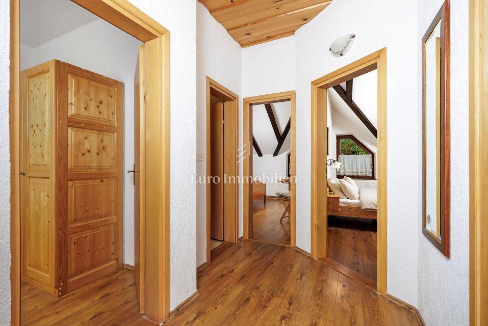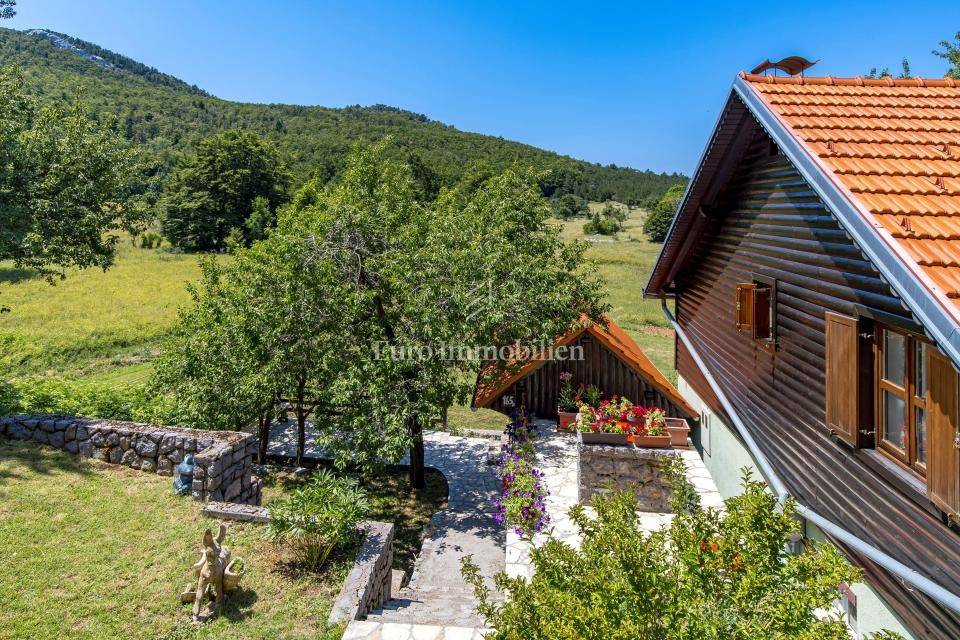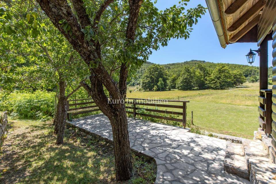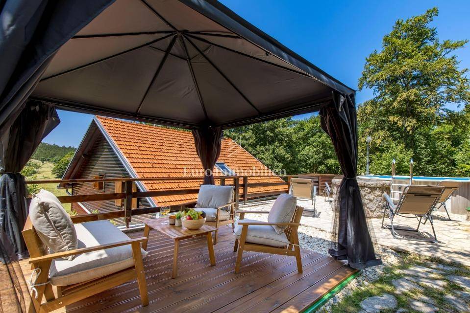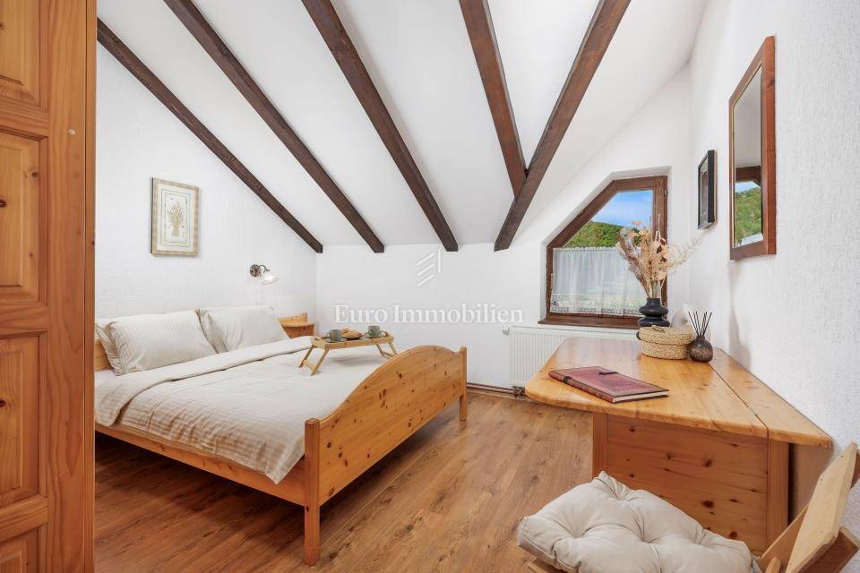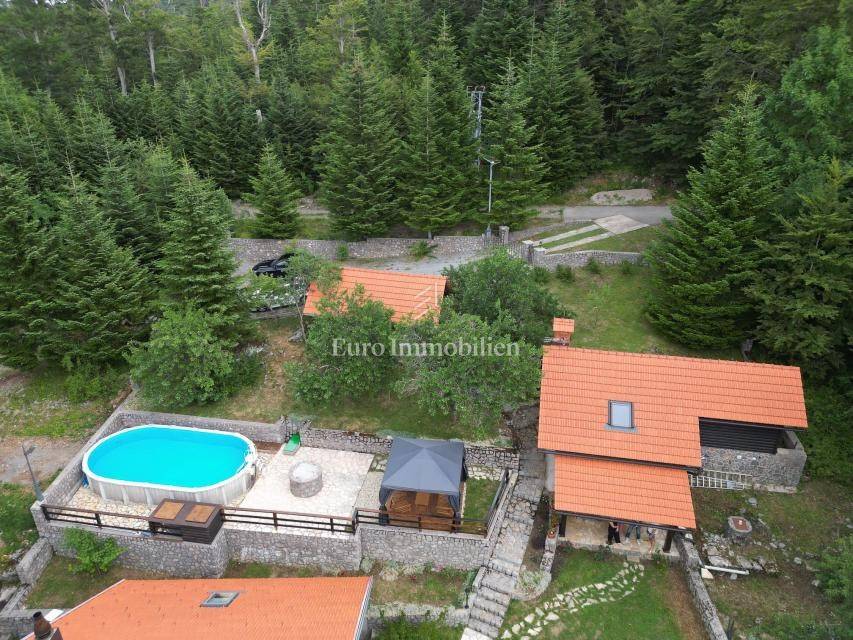 Ein kleines Nebengebäude dient als zusätzliche Unterkunft oder für weitere Zwecke. Der terrassenförmig angelegte Garten verfügt über Pool, Sonnendeck, Grillplatz, Leseecke im Freien und Kinderspielplatz. Großzügiger Parkplatz und Wiese im Wald bieten Ruhe und Privatsphäre.