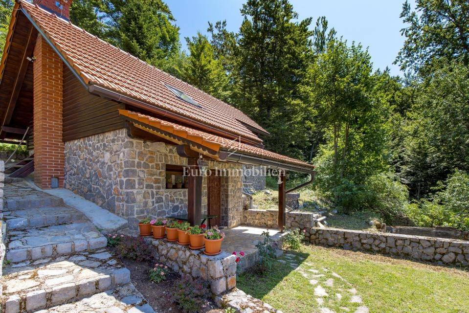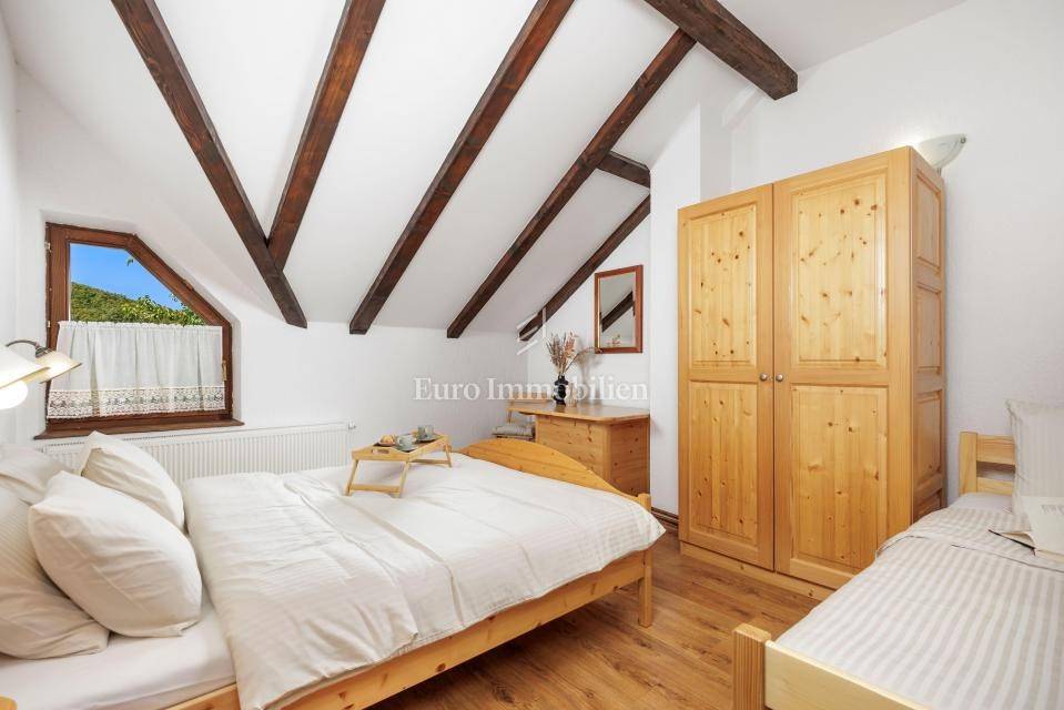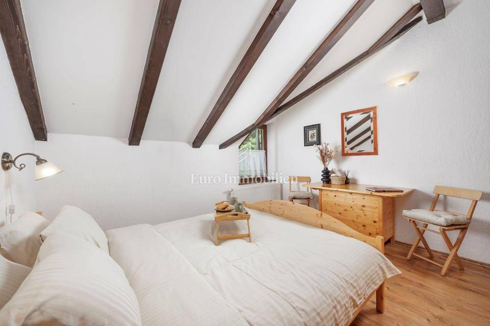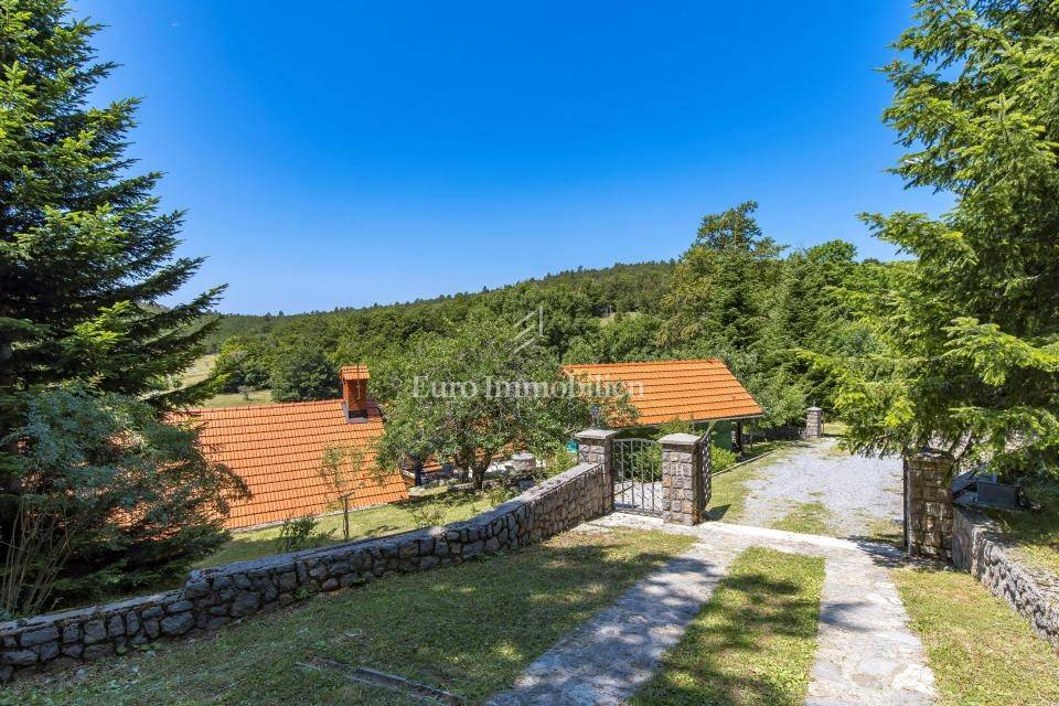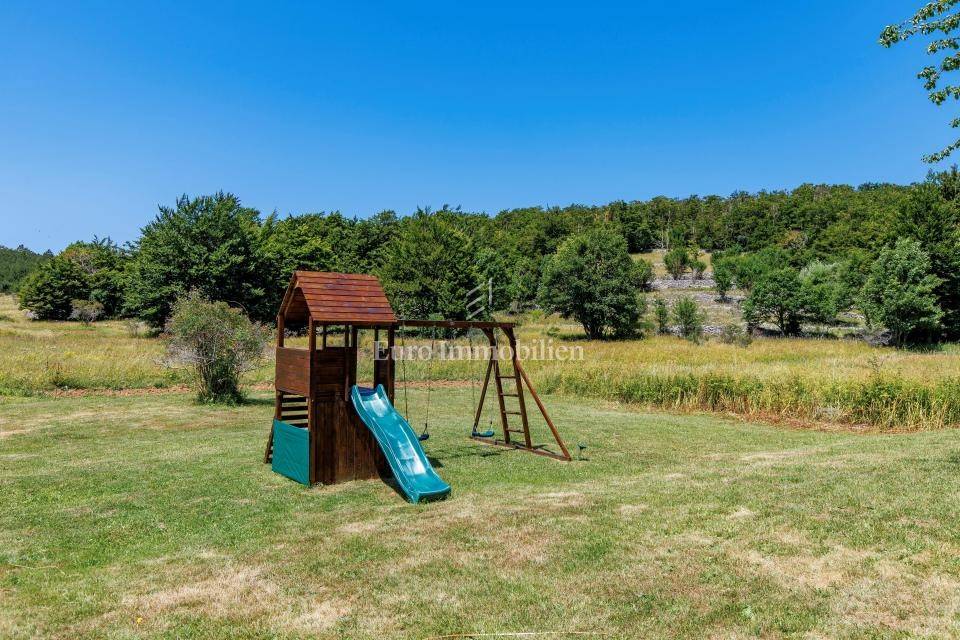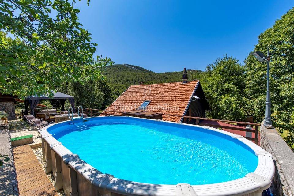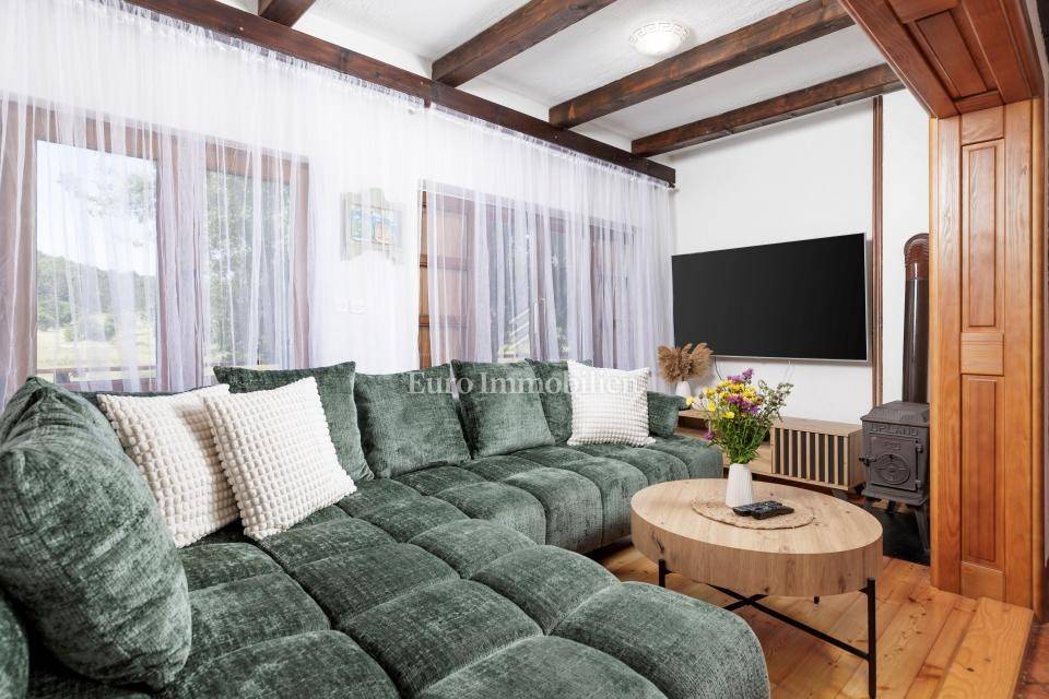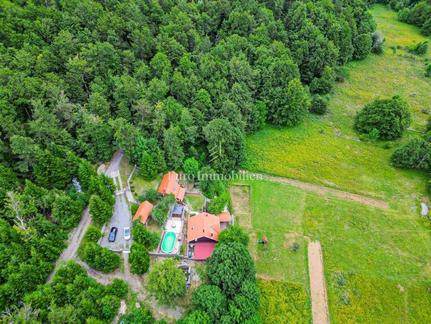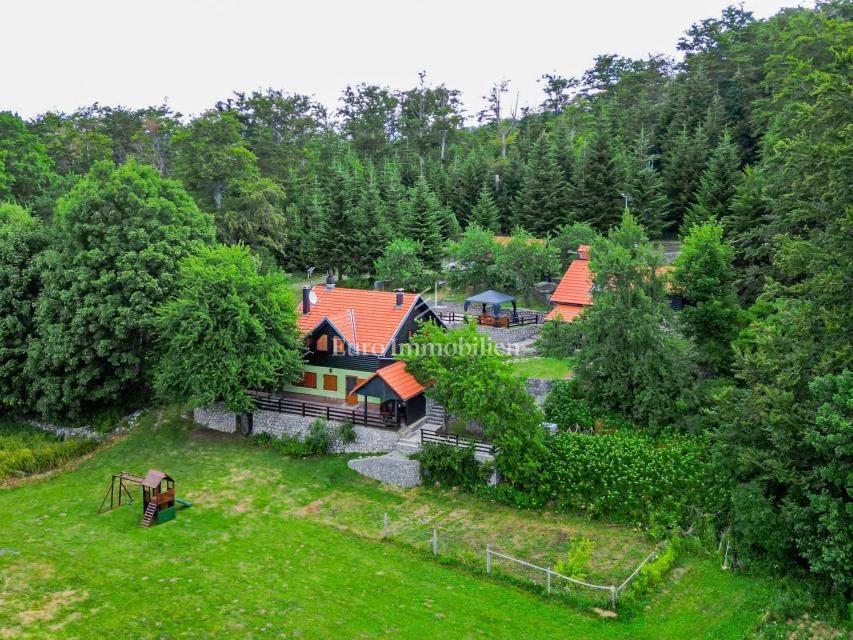 Ein kleines Nebengebäude dient als zusätzliche Unterkunft oder für weitere Zwecke. Der terrassenförmig angelegte Garten verfügt über Pool, Sonnendeck, Grillplatz, Leseecke im Freien und Kinderspielplatz. Großzügiger Parkplatz und Wiese im Wald bieten Ruhe und Privatsphäre.